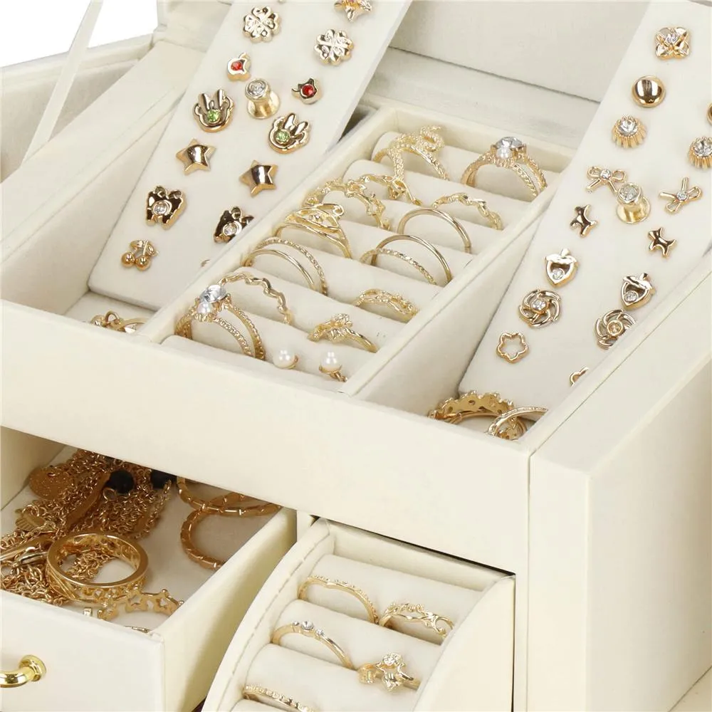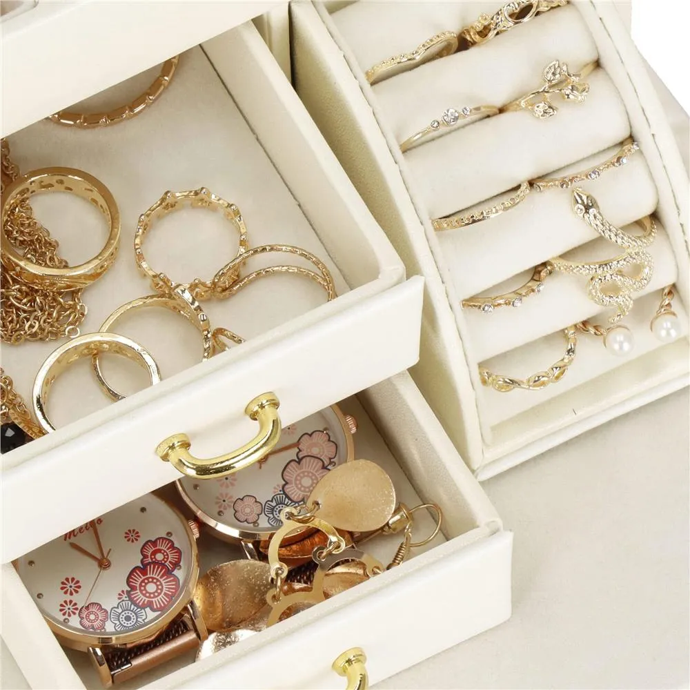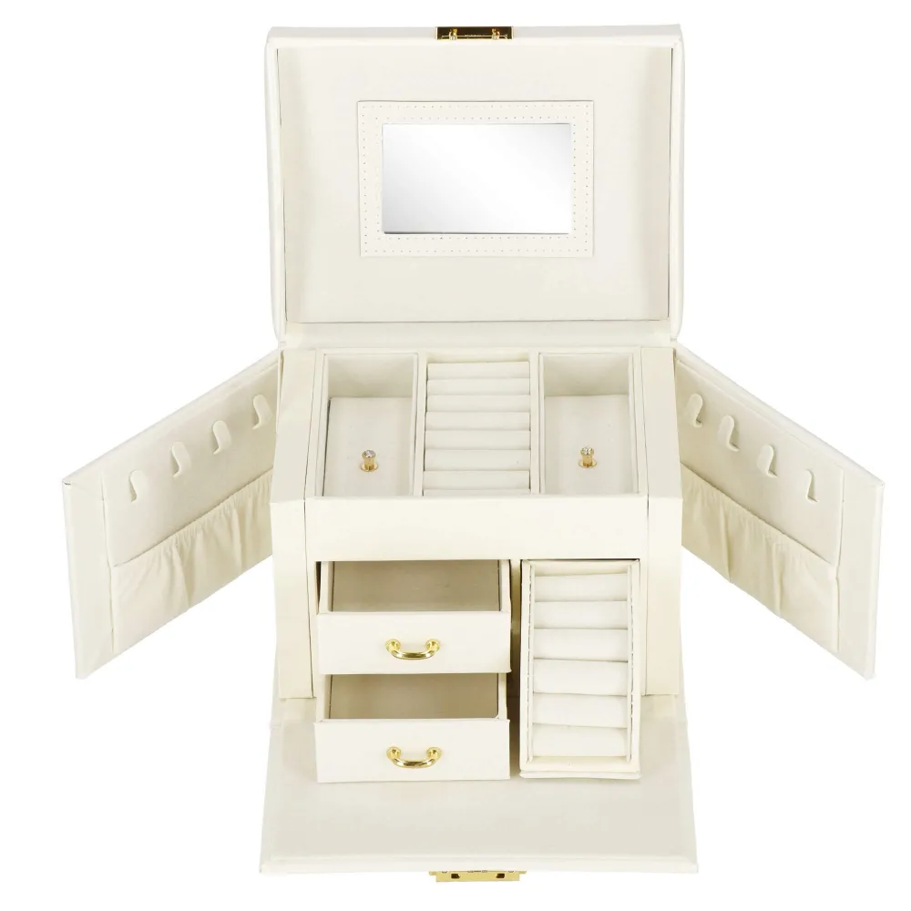 Elegantný organizér na šperky ponúka praktické riešenie na prehľadné uloženie doplnkov. Zámok s kľúčom a rukoväť pre ľahké prenášanie zaisťujú bezpečnosť aj mobilitu. Priehradky na náušnice a prstene pojmú mnoho doplnkov, vo vnútri sa nachádza zrkadlo a priestranné priehradky. Dolné zásuvky poskytujú ďalší úložný priestor. Bočné steny s háčikmi a vreckom, zamatový materiál a štýlový dizajn z nej robia ideálny darček pre ženy.
