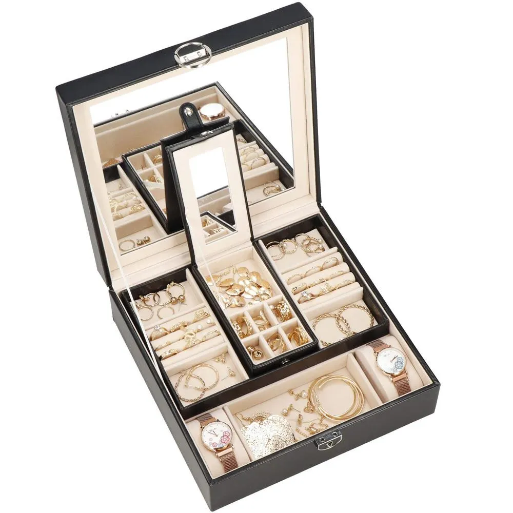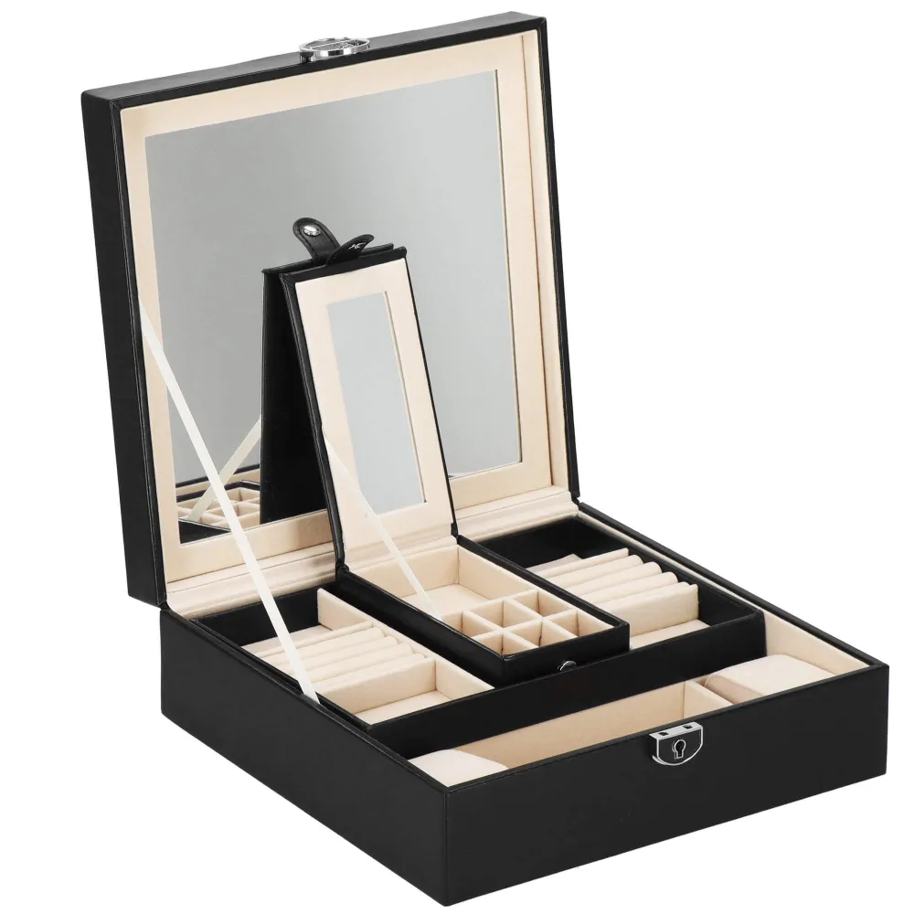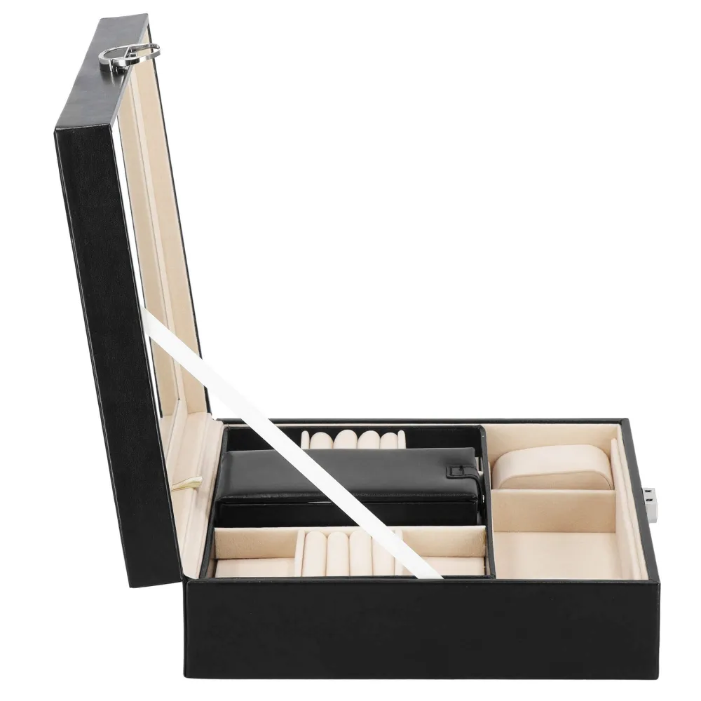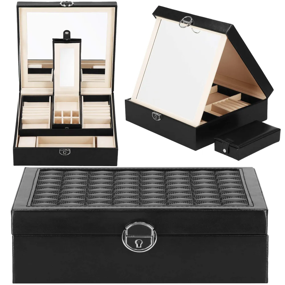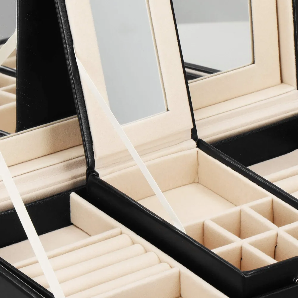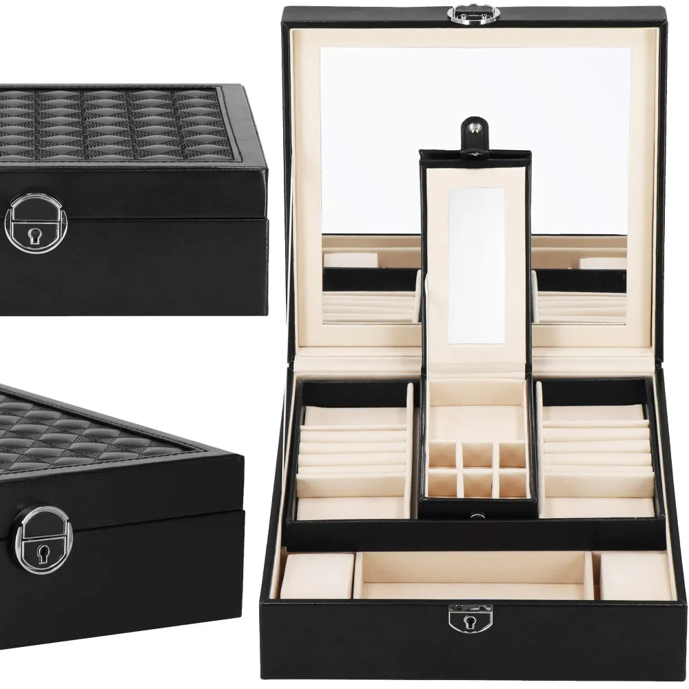 Luxusný organizér na šperky uchová všetky doplnky prehľadne a bezpečne. Zámok s kľúčom zaistí obsah, odnímateľný cestovný organizér, tiež so zrkadielkom vo vnútri je ideálny na cesty. Priehradky na náušnice a prstene pojmú mnoho doplnkov, nechýba veľké zrkadlo s nastaviteľným sklonom, 2 priehradky na hodinky a náramky ani priestranné priehradky. Zamatový interiér, luxusný dizajn a ideálny darček pre blízke ženy zaistia, že vaše šperky na jednom mieste budú vždy chránené a ľahko dostupné.