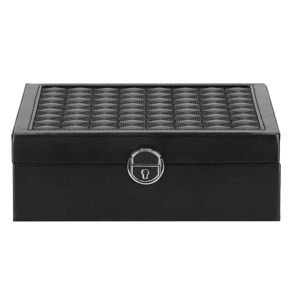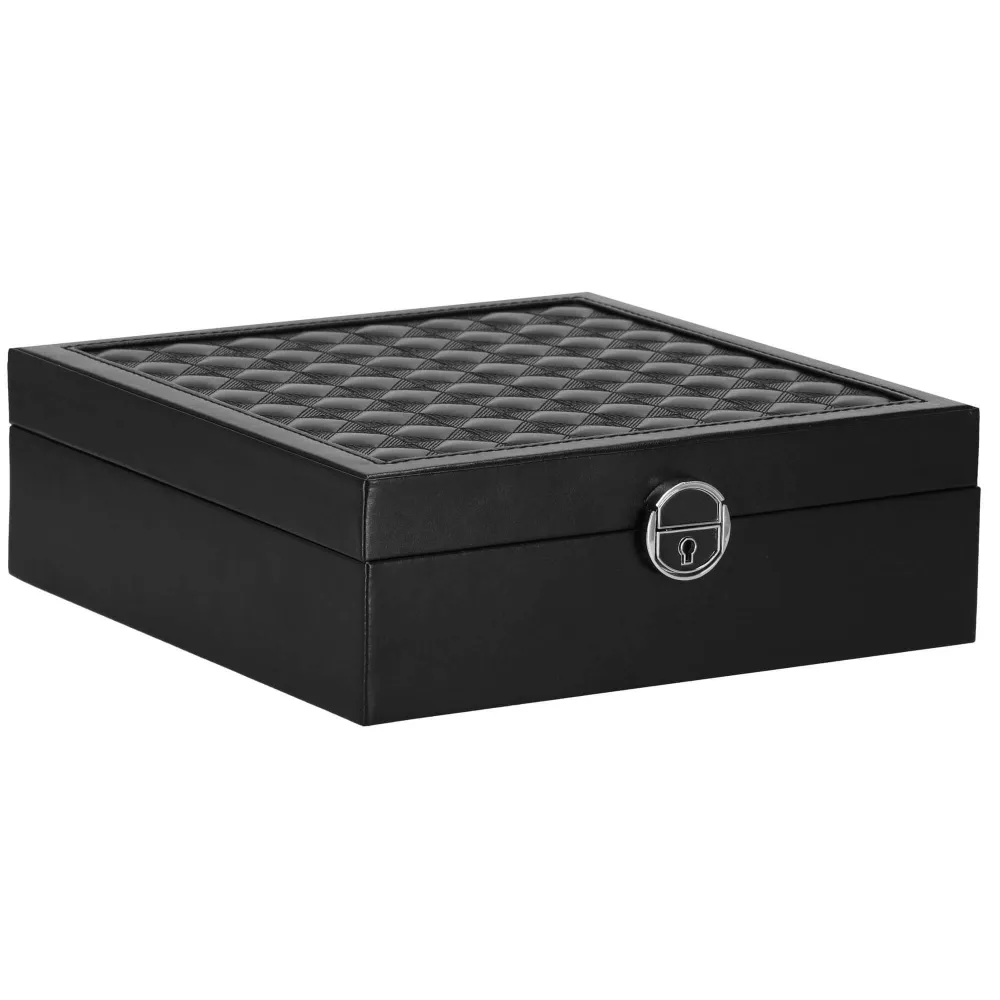 Šperkovnica SPRINGOS NOLITA čierna je elegantný a praktický organizér na šperky , ktorý pomáha udržať všetky vaše doplnky prehľadne usporiadané a bezpečne uložené. Vďaka zámku s kľúčom máte istotu, že obsah zostane chránený, a odnímateľný cestovný organizér aj so zrkadielkom vo vnútri vám umožní vziať si najobľúbenejšie šperky pohodlne aj na cesty. Priehradky na náušnice a prstene pojmú mnoho doplnkov , takže zabudnete na zdĺhavé hľadanie stratenej náušnice alebo rozpletanie náhrdelníka. Nechýbajú ani 2 priehradky pre hodinky a náramky , priestranné priehradky pre ďalšie šperky a veľké zrkadlo s nastaviteľným sklonom , ktoré uľahčia každodennú prípravu.