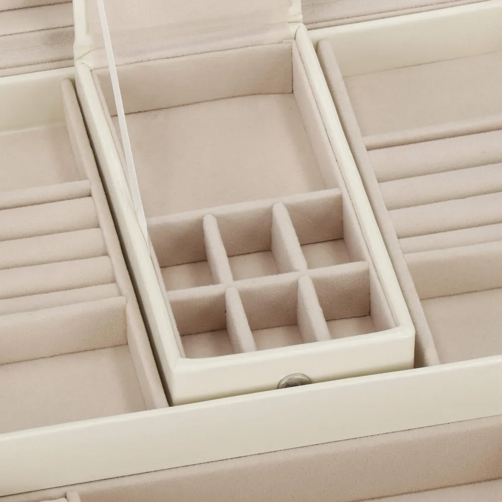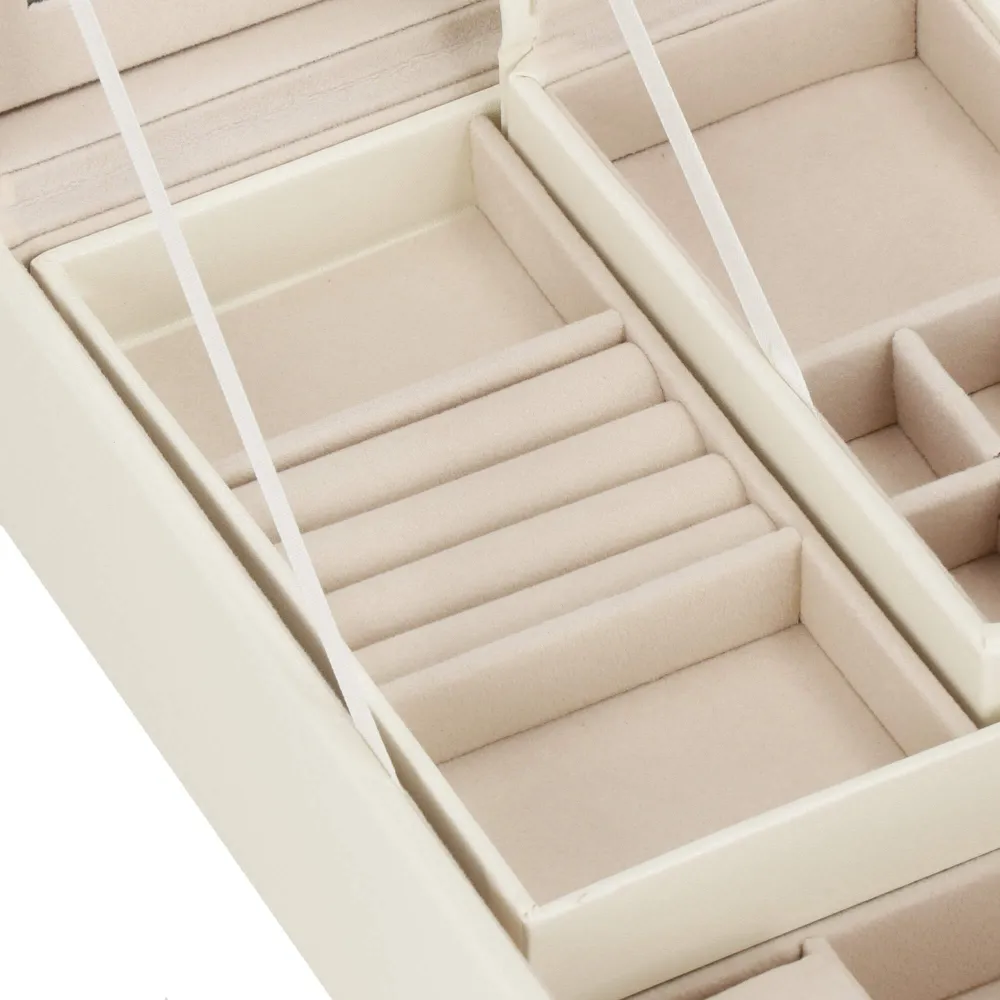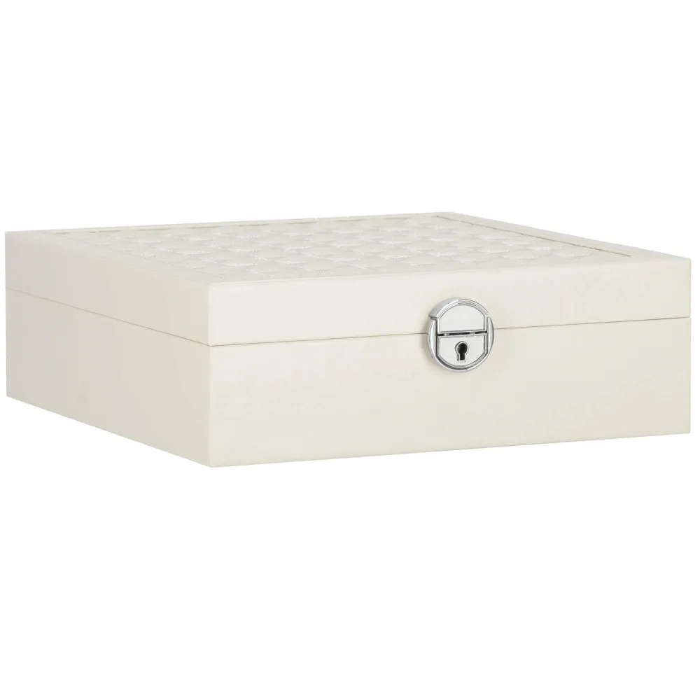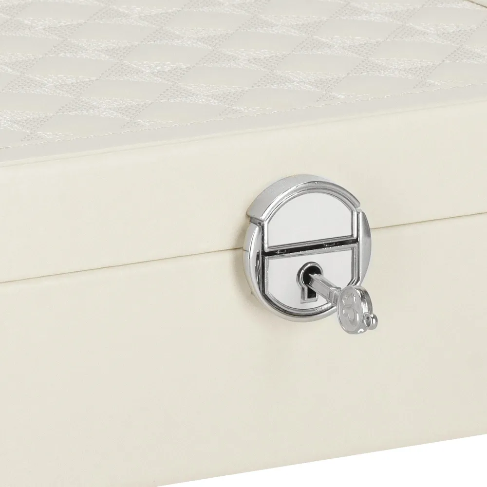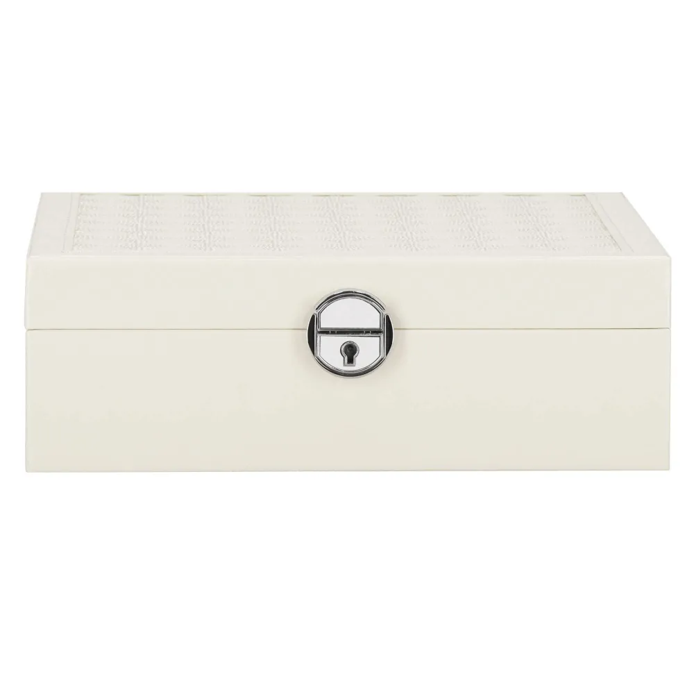 Šperkovnica SPRINGOS NOLITA biela je elegantný a praktický organizér na šperky , ktorý pomáha udržať všetky vaše doplnky prehľadne usporiadané a bezpečne uložené. Vďaka zámku s kľúčom máte istotu, že obsah zostane chránený, a odnímateľný cestovný organizér aj so zrkadielkom vo vnútri vám umožní vziať si najobľúbenejšie šperky pohodlne aj na cesty. Priehradky na náušnice a prstene pojmú mnoho doplnkov , takže zabudnete na zdĺhavé hľadanie stratenej náušnice alebo rozpletanie náhrdelníka. Nechýbajú ani 2 priehradky pre hodinky a náramky , priestranné priehradky pre ďalšie šperky a veľké zrkadlo s nastaviteľným sklonom , ktoré uľahčia každodennú prípravu.