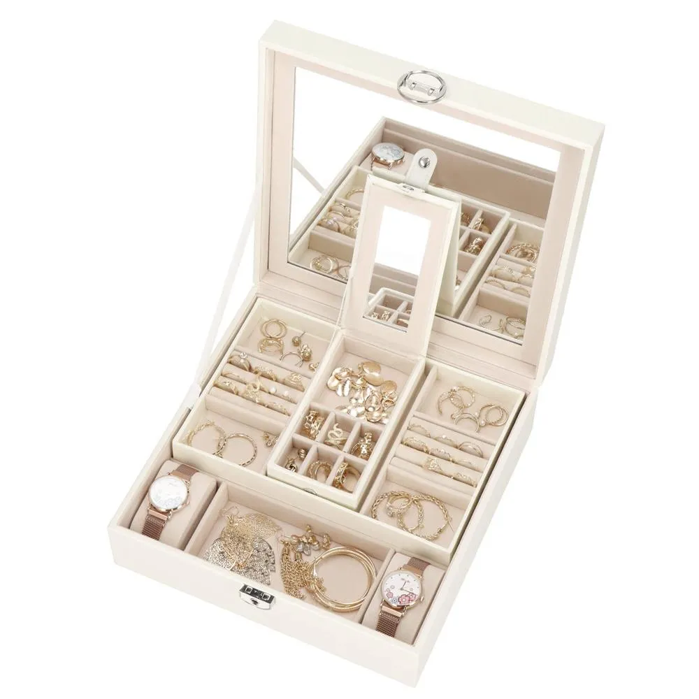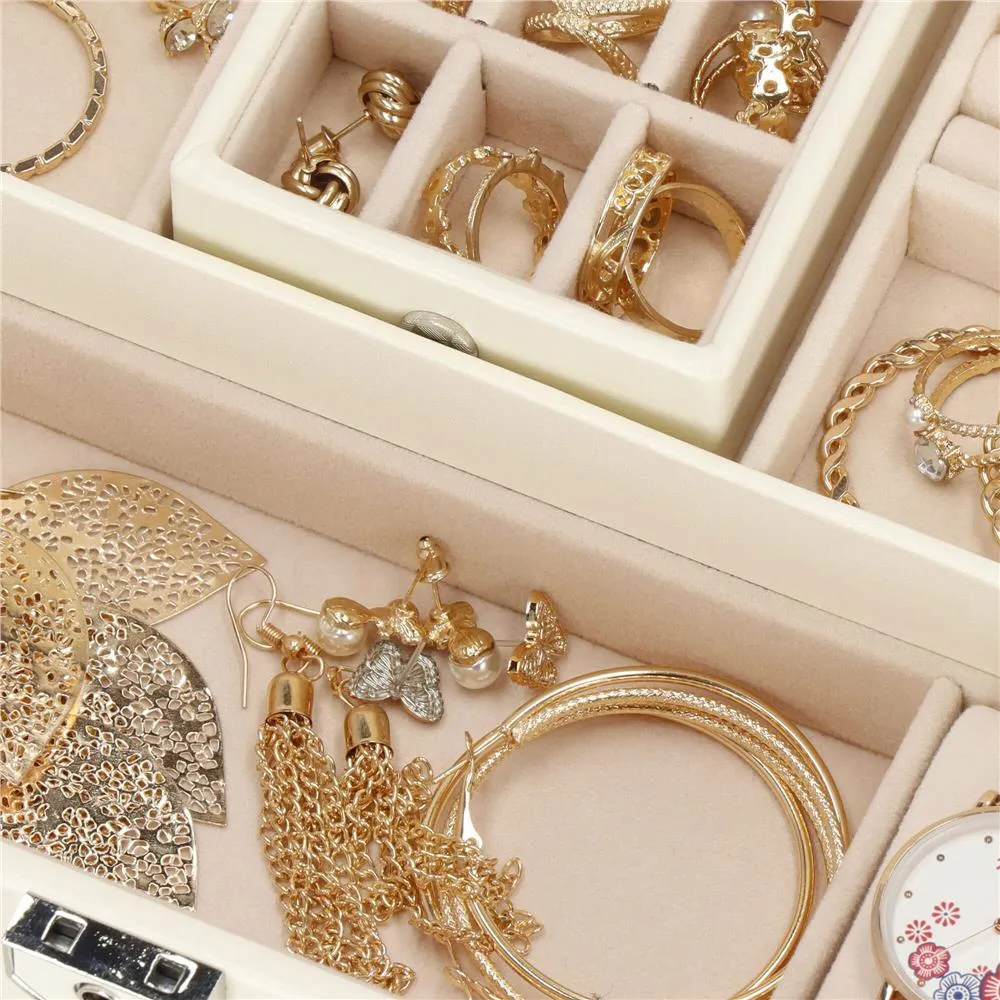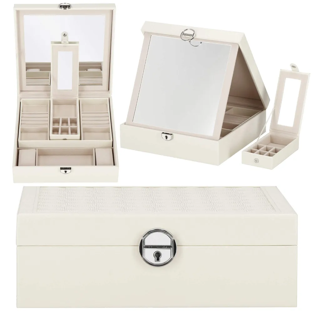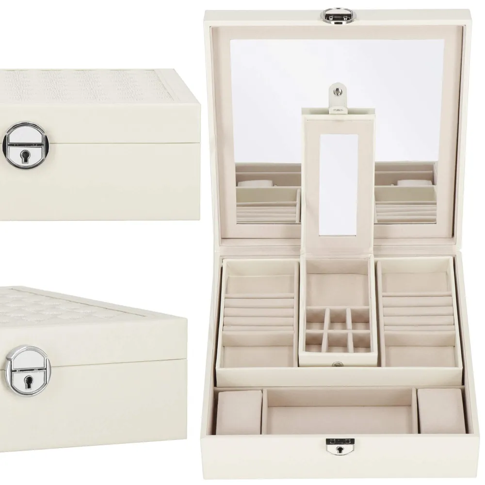 Luxusný organizér na šperky uchová všetky doplnky prehľadne a bezpečne. Zámok s kľúčom zaistí obsah, odnímateľný cestovný organizér, taktiež so zrkadielkom vo vnútri je ideálny na cesty. a ideálny darček pre blízke ženy zaistia, že vaše šperky na jednom mieste budú vždy chránené a ľahko dostupné.