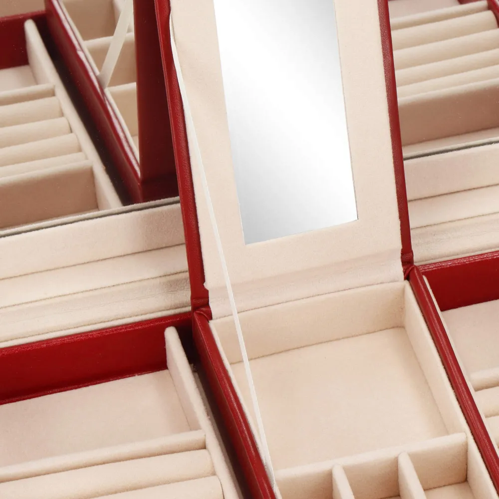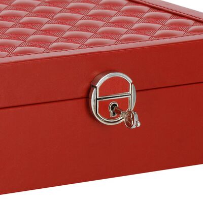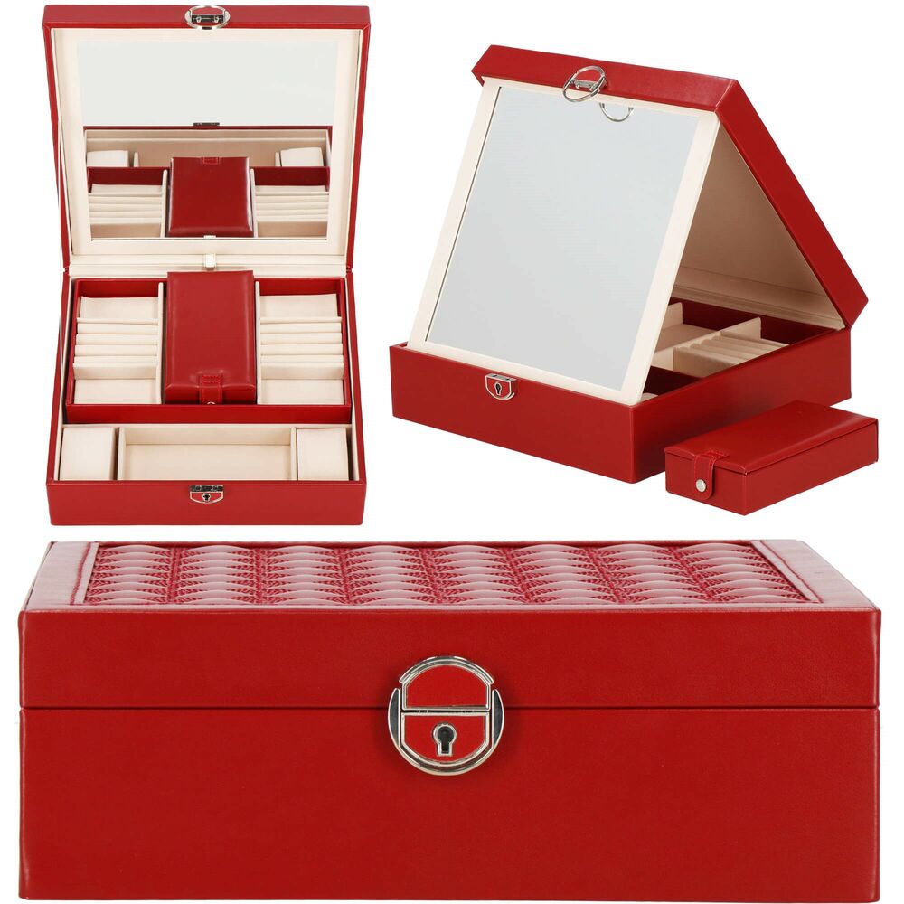 Šperkovnica SPRINGOS NOLITA červená je elegantný a praktický organizér na šperky , ktorý pomáha udržať všetky vaše doplnky prehľadne usporiadané a bezpečne uložené. Vďaka zámku s kľúčom máte istotu, že obsah zostane chránený, a odnímateľný cestovný organizér aj so zrkadielkom vo vnútri vám umožní vziať si najobľúbenejšie šperky pohodlne aj na cesty. Priehradky na náušnice a prstene pojmú mnoho doplnkov , takže zabudnete na zdĺhavé hľadanie stratenej náušnice alebo rozpletanie náhrdelníka. Nechýbajú ani 2 priehradky pre hodinky a náramky , priestranné priehradky pre ďalšie šperky a veľké zrkadlo s nastaviteľným sklonom , ktoré uľahčia každodennú prípravu.