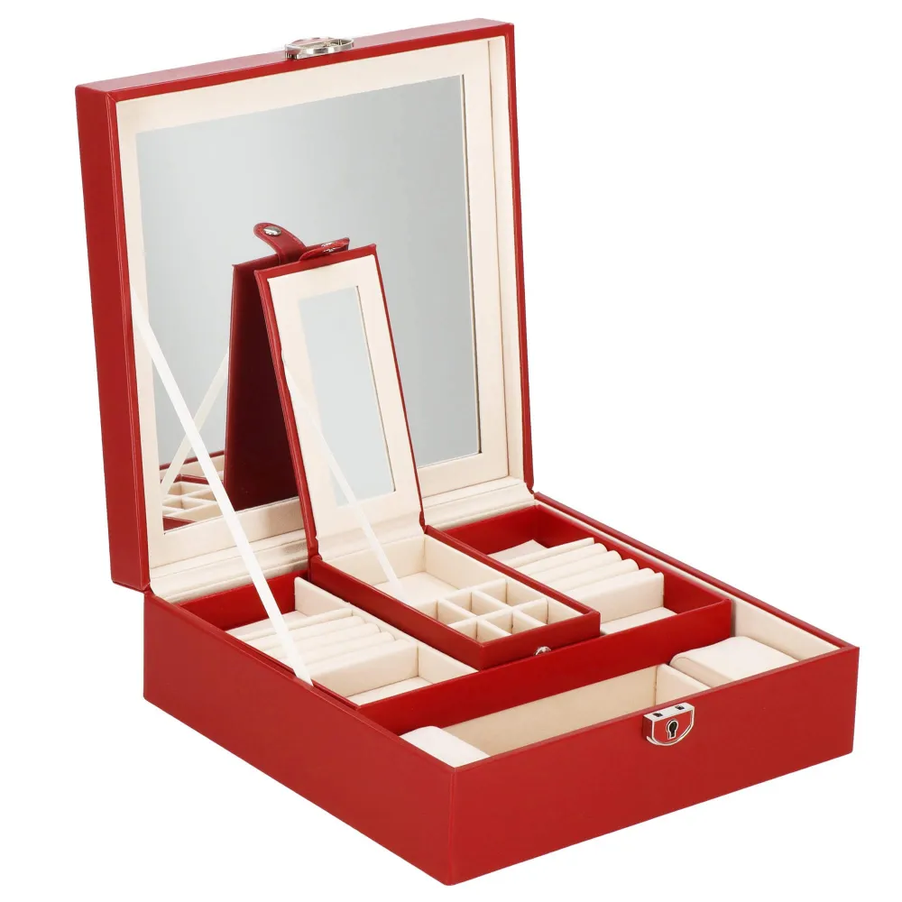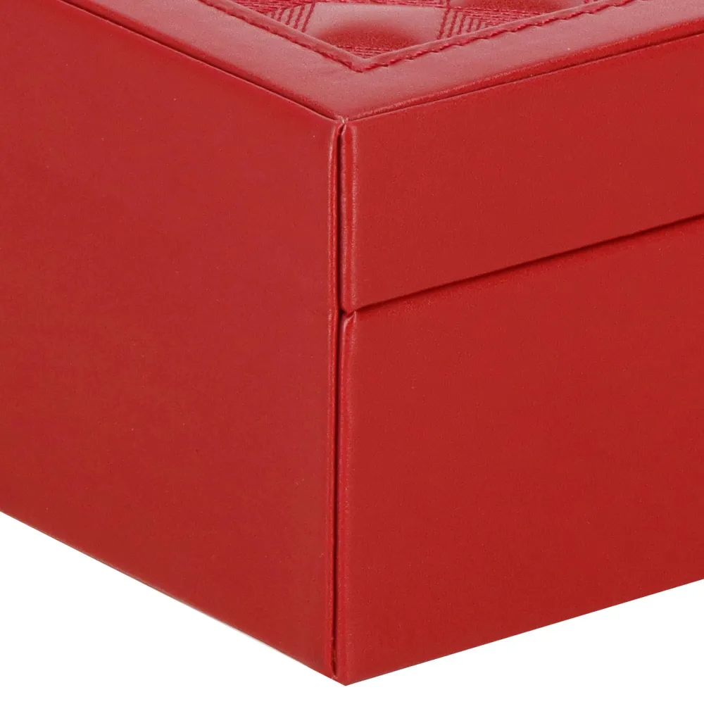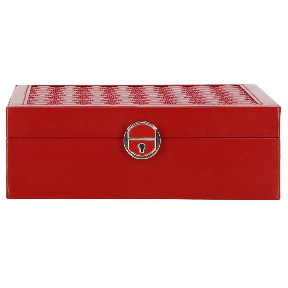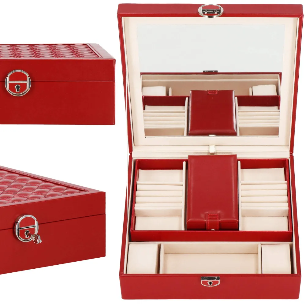 Šperkovnica SPRINGOS NOLITA červená je elegantný a praktický organizér na šperky , ktorý pomáha udržať všetky vaše doplnky prehľadne usporiadané a bezpečne uložené. Vďaka zámku s kľúčom máte istotu, že obsah zostane chránený, a odnímateľný cestovný organizér aj so zrkadielkom vo vnútri vám umožní vziať si najobľúbenejšie šperky pohodlne aj na cesty. Priehradky na náušnice a prstene pojmú mnoho doplnkov , takže zabudnete na zdĺhavé hľadanie stratenej náušnice alebo rozpletanie náhrdelníka. Nechýbajú ani 2 priehradky pre hodinky a náramky , priestranné priehradky pre ďalšie šperky a veľké zrkadlo s nastaviteľným sklonom , ktoré uľahčia každodennú prípravu.