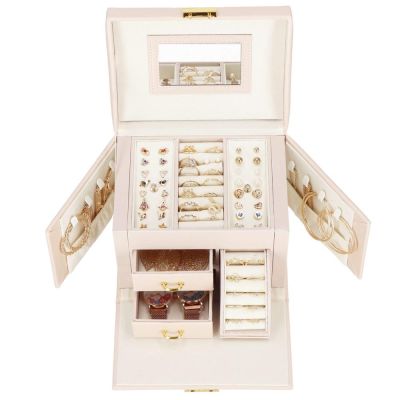 Elegantný organizér na šperky ponúka praktické riešenie na prehľadné uloženie doplnkov. Zámok s kľúčom a rukoväť pre ľahké prenášanie zaisťujú bezpečnosť aj mobilitu. Priehradky na náušnice a prstene pojmú mnoho doplnkov, vo vnútri sa nachádza zrkadlo a priestranné priehradky. Dolné zásuvky poskytujú ďalší úložný priestor. Bočné steny s háčikmi a vreckom, zamatový materiál a štýlový dizajn z nej robia ideálny darček pre ženy.