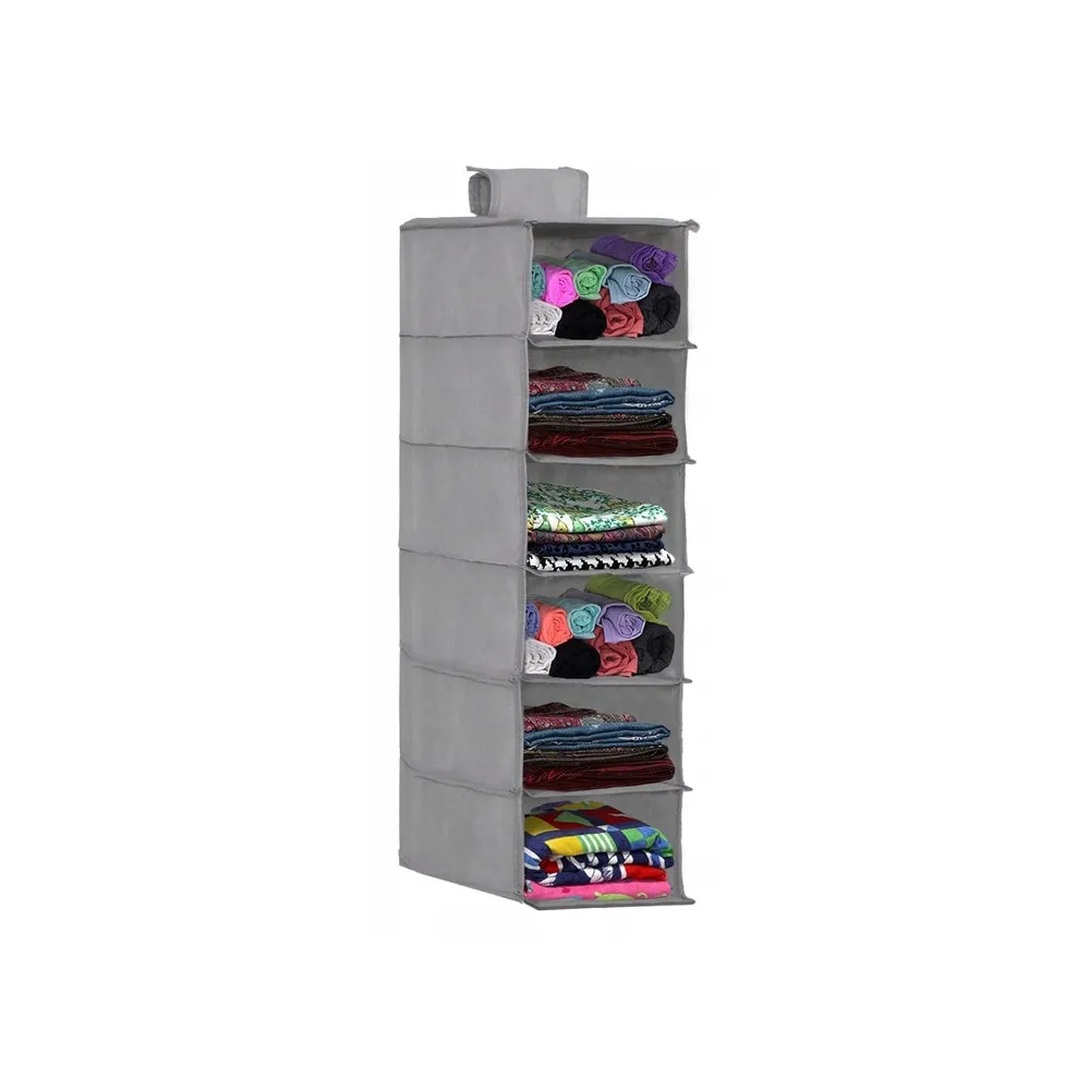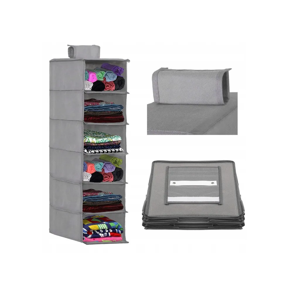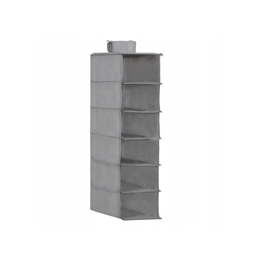 Závesný organizér/regál so 6 policami a pútkom na uchytenie je výborný doplnok pre šatníkovú skriňu, do spálne, kúpeľne alebo detskej izby. Kompaktné skladacie prevedenie so zosilnenými dnom každej police. Rozmery 30x30x120 cm.