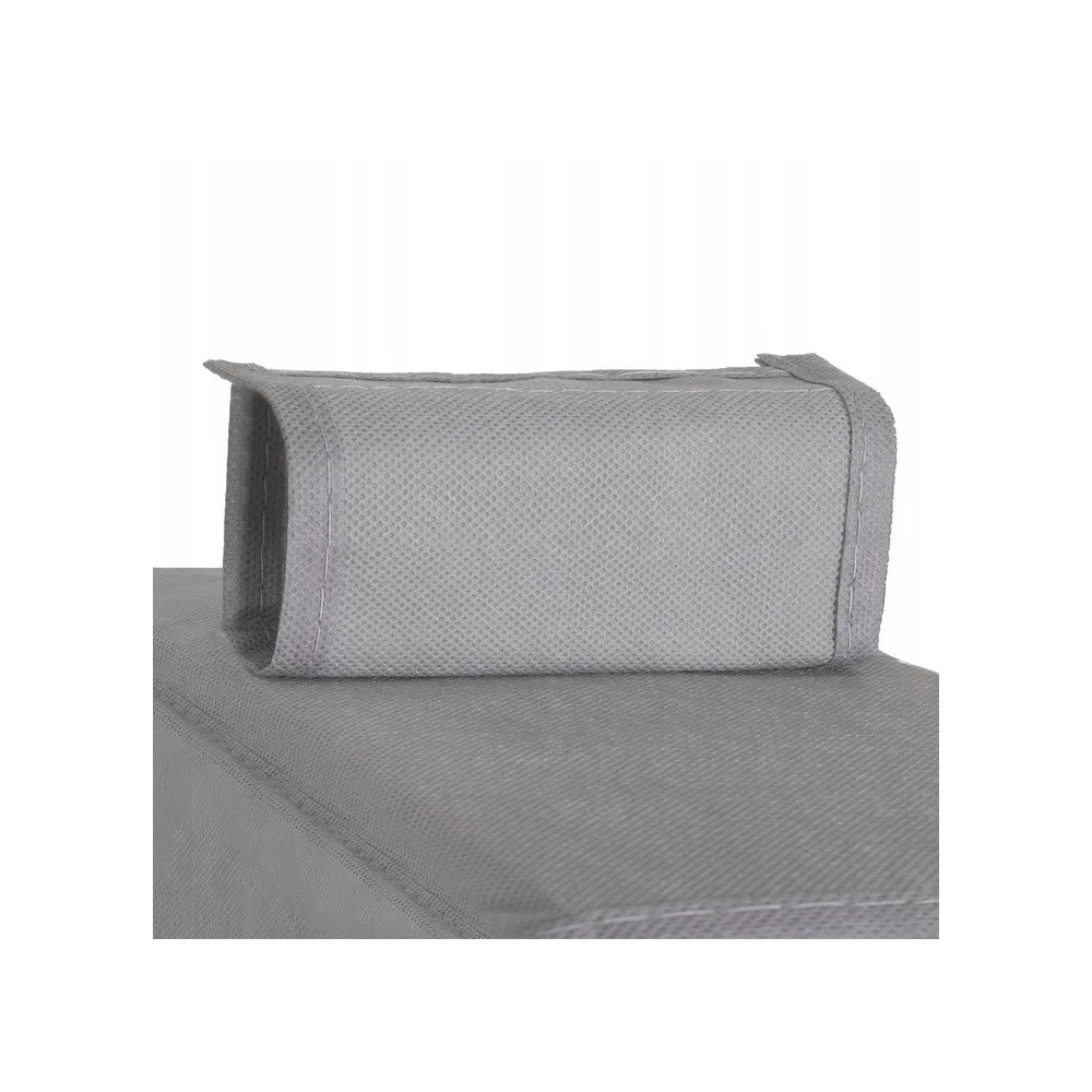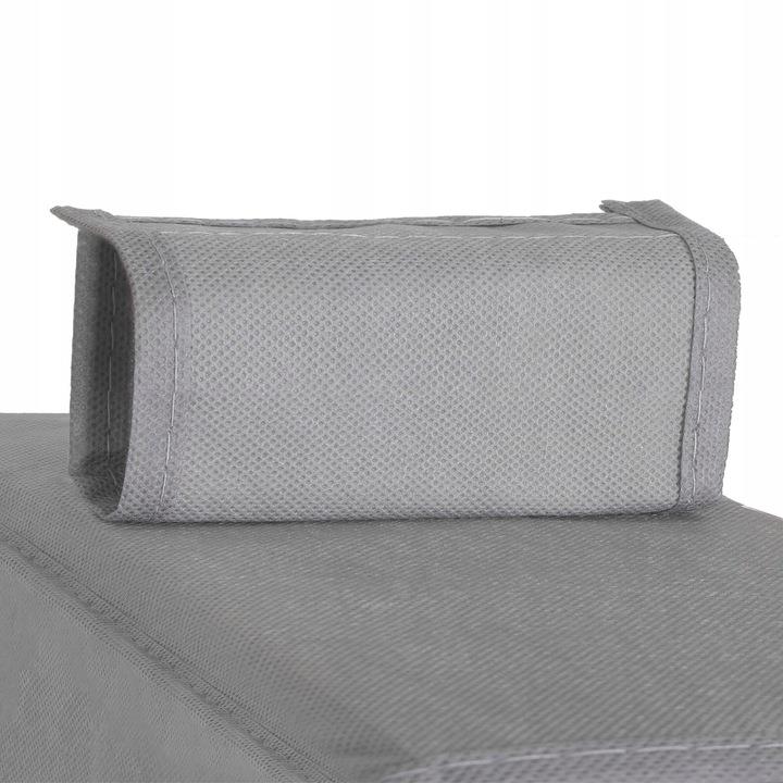 Výrobok má podlhovastý tvar a pomocou jednoduchého systému uchytenia na suchý ZIP ho ľahko a rýchlo zavesíte na akúkoľvek tyč alebo konzoly . Organizér je vyrobený z netkanej textílie so zosilneným dnom každej police. Vďaka použitému materiálu je ľahký, priedušný a drží pevný tvar. Po zložení má úplne minimálne rozmery.