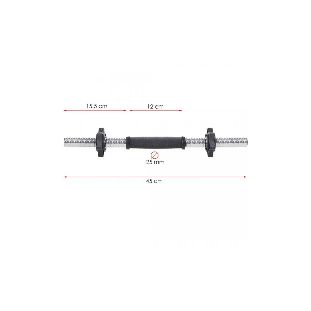 Univerzálny hriadeľ na jednoručnú nakladaciu činku, vhodný pre efektívny tréning doma aj v telocvični. Dĺžka 45cm, os 25mm, max. zaťaženie 50kg, rovné prevedenie so závitom a maticami.