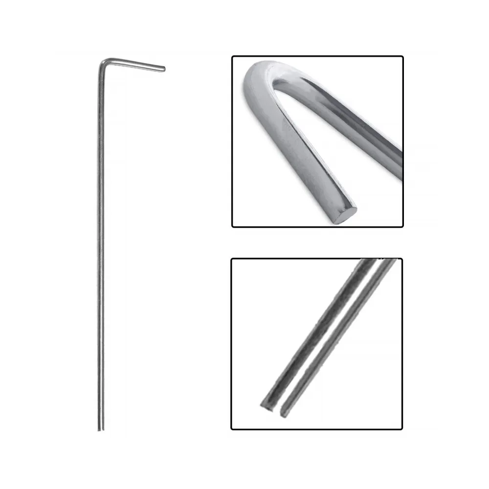 Sada 10 kovových kotiev pre spoľahlivé ukotvenie stanu, prístrešku či plachty . Každý kolík má dĺžku 17,5 cm, háčik dlhý 2,5 cm a priemer 4 mm, čo zaisťuje pevnosť a odolnosť aj v náročnejších podmienkach. Odolný materiál sa neohýba a je vhodný na opakované použitie.