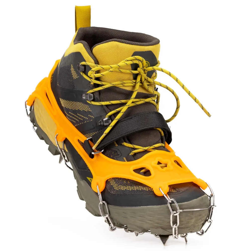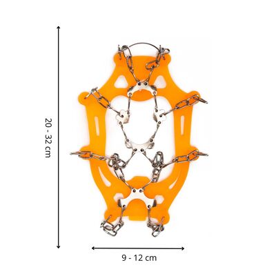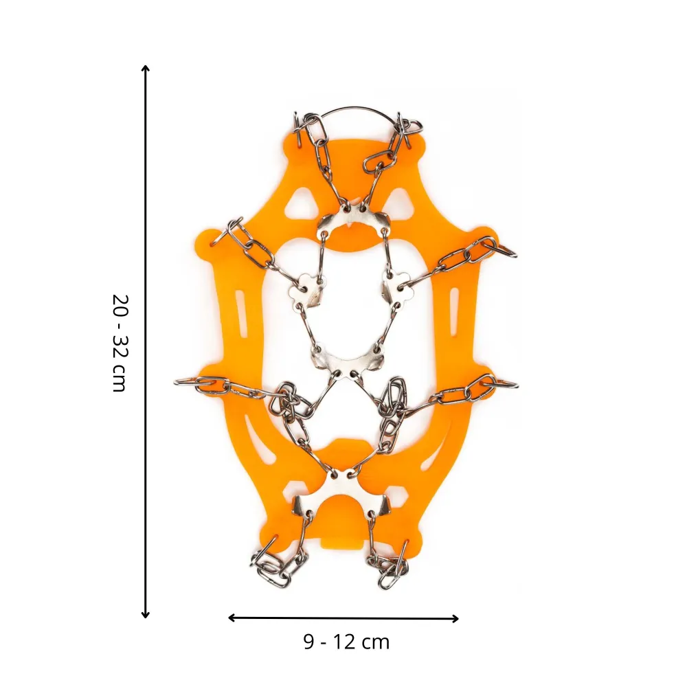 Konštrukcia z nerezovej ocele a silikónového TPE plastu zaisťuje vysokú odolnosť a pružnosť pre pohodlné nasadenie na obuv. Súčasťou balenia sú stabilizačné popruhy , ktoré prispievajú k pevnému uchyteniu, a praktický obal pre ľahké prenášanie a skladovanie. Výrazná oranžová farba navyše zvyšuje viditeľnosť v zimnom prostredí.