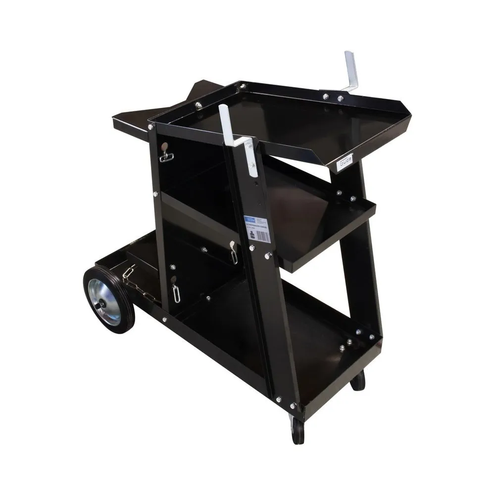 Praktický mobilný zvárací vozík s 3 plošinami, 2 pevnými a 2 otočnými kolieskami. Držiak plynovej fľaše s dvoma nastaviteľnými reťazami.