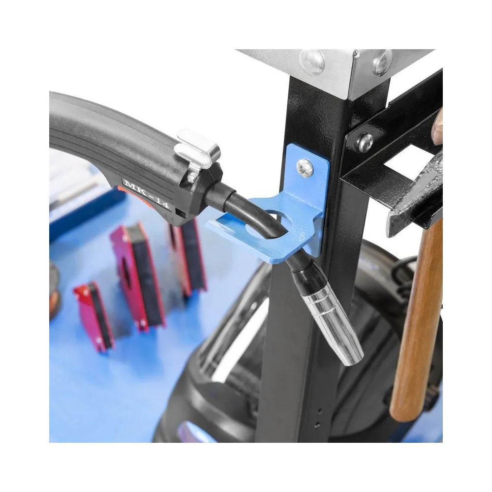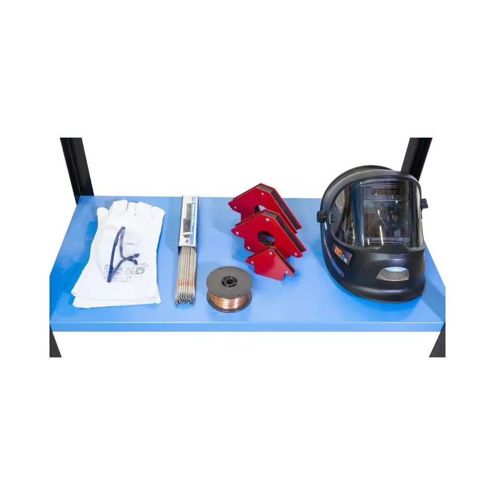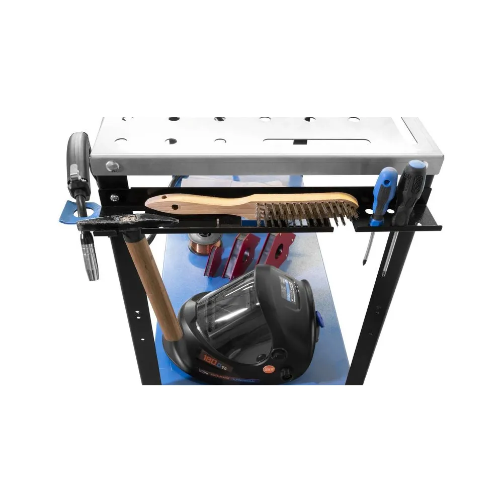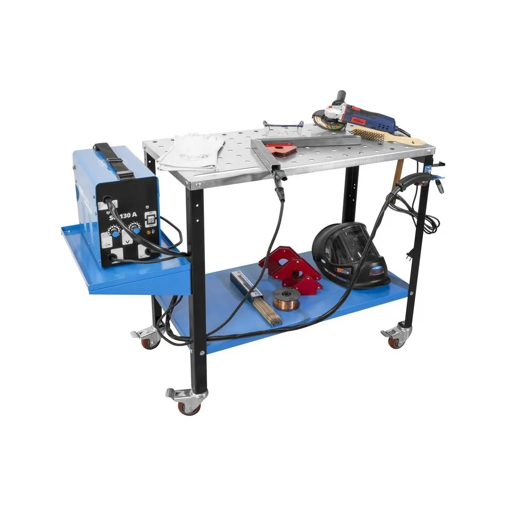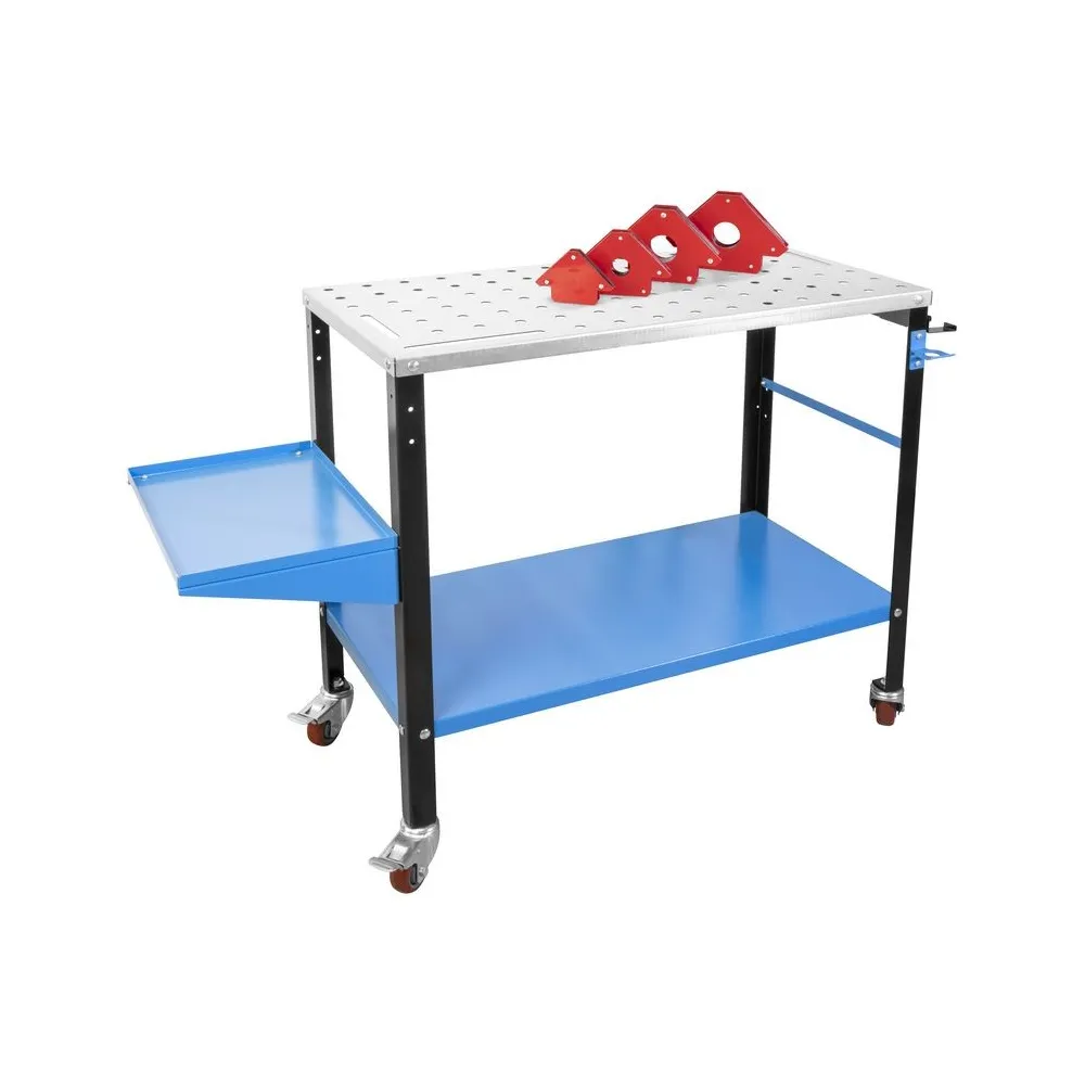 Pozinkovaný stôl na zváranie na použitie v dielni a garáži. Pevný, laserom vyrezávaný povrch stola s otvormi na zváracie svorky pre bezpečné upevnenie zvarového kovu. S pozdĺžnymi otvormi na upevnenie zverákov a uhlových svoriek. Maximálnu pohyblivosť a absolútnu stabilitu zaisťujú 4 otočné kolieska so zaisťovacou brzdou. S konzolou zváracieho stola a držiakom elektród alebo držiakom horáka, ako aj lištou na náradie na bezpečné uloženie všetkých dôležitých dielov. Priestranná odkladacia priehradka pod stolom ponúka dostatok miesta pre dôležité príslušenstvo a zaisťuje poriadok a prehľadnosť. Štvordielna sada magnetov na zváranie umožňuje bezpečné polohovanie a upevnenie pri spájaní zvarového kovu.