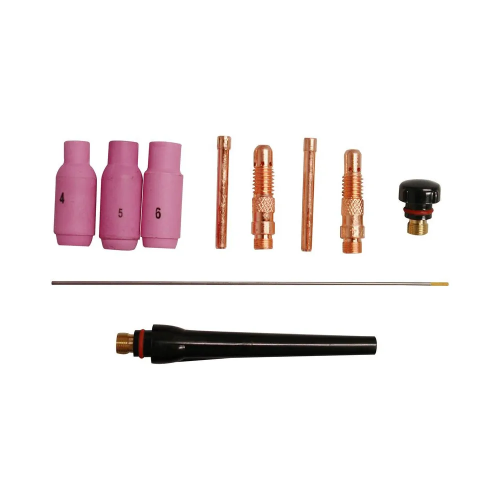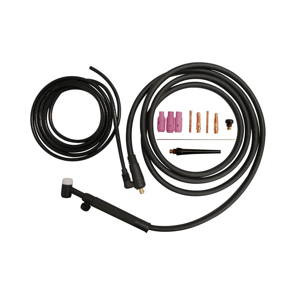 Uzemňovací kábel 4 m so svorkou, WIG horák 3 m, nástrčný konektor 9 mm, 1,6 mm WIG ihla, 3 keramické trysky (4/5/6), prúdová tryska, (1,6 a 2,4 mm), klieštiny (1,6 a 2,4 mm). Kompatibilný s invertorovými zváračkami s prúdovým rozsahom do 150 A (20046, 20047, 20051, 20055, 20056).
