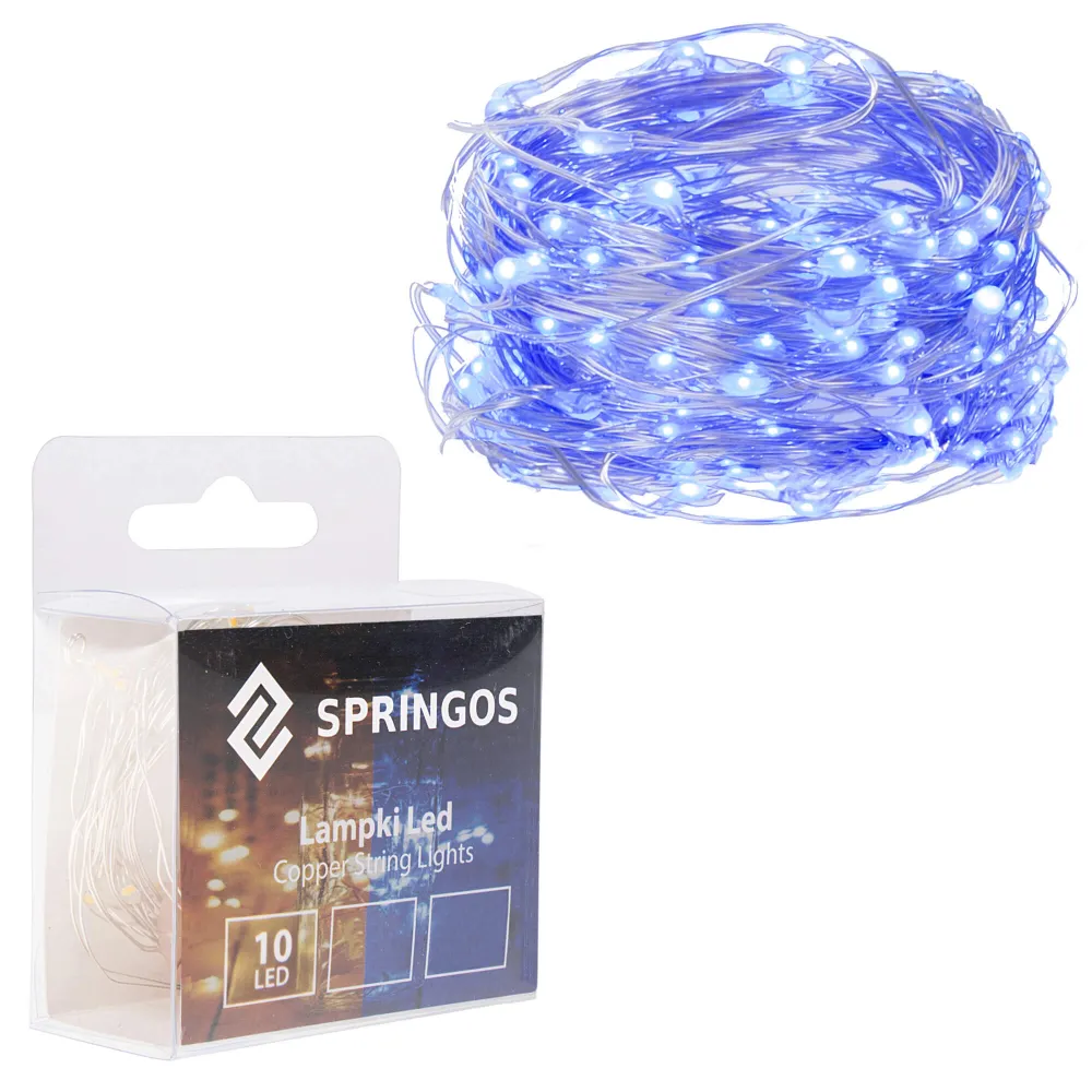 Ultratenká svetelná reťaz s napájaním na batérie. Dĺžka svetelnej časti 0,9 m, napájací kábel 30 cm, vnútorné použitie. Farba svetla modrá, 10 LED, napájanie 2x AA batérie.