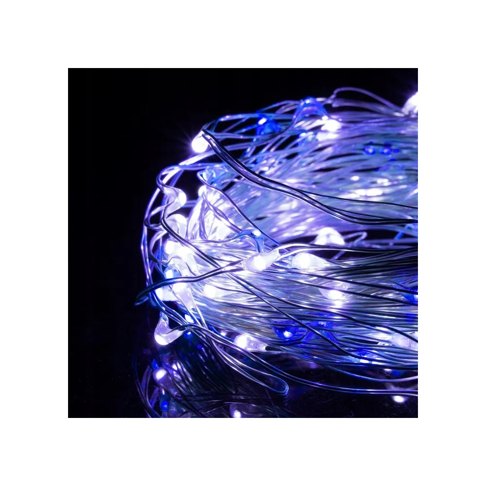 Ultratenká svetelná reťaz s napájaním na batérie. Dve farby svetla, napoly biely, napoly modrý. Dĺžka svetelnej časti 1,9 m, napájací kábel 30 cm. Vnútorné použitie, 20 LED, napájanie 2x AA batérie.