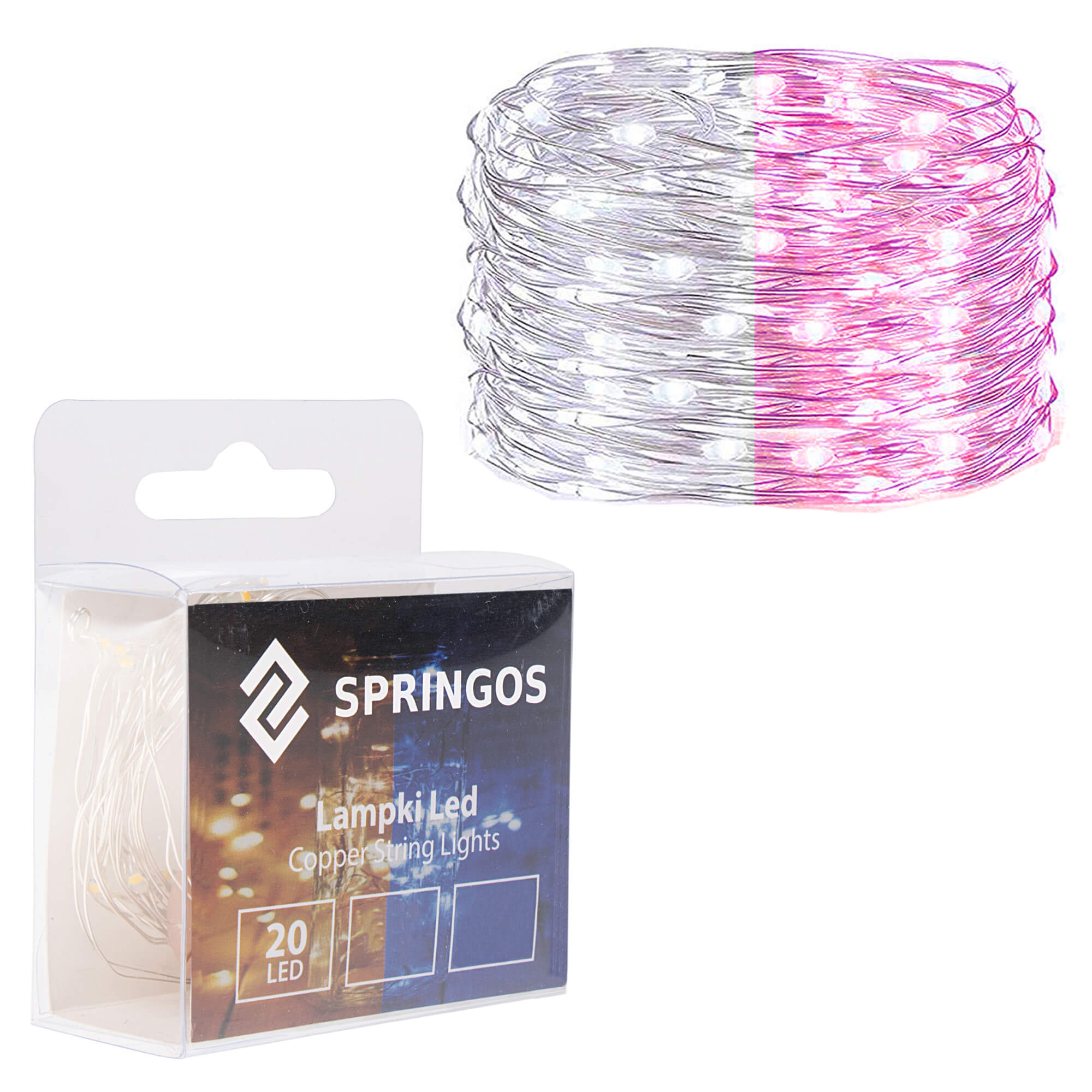 Ultratenká svetelná reťaz s napájaním na batérie. Dve farby svetla, napoly biely, napoly ružový. Dĺžka svetelnej časti 1,9 m, napájací kábel 30 cm. Vnútorné použitie, 20 LED, napájanie 2x AA batérie.