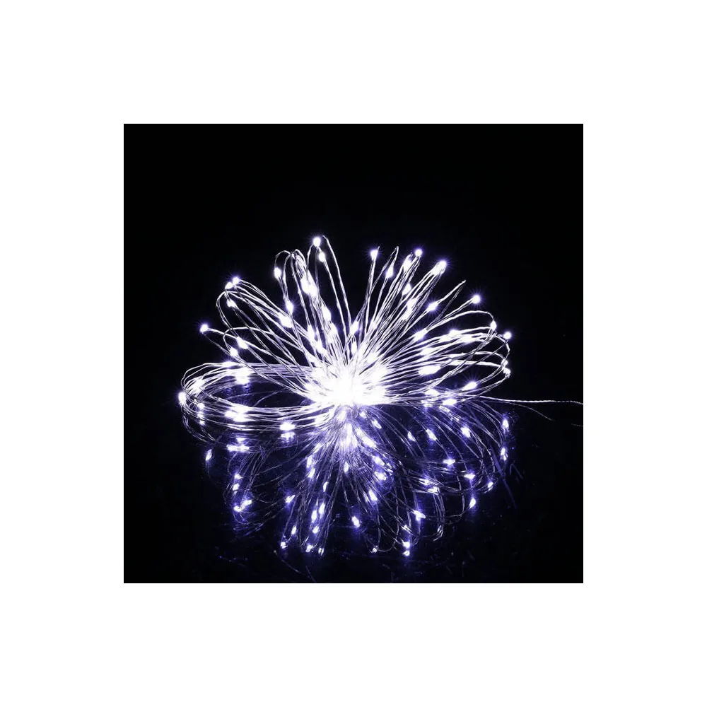 Ultratenká svetelná reťaz s napájaním na batérie. Dĺžka svetelnej časti 4,9 m, napájací kábel 30 cm, vnútorné použitie. Farba svetla studená biela, 50 LED, napájanie 3x AA batérie.