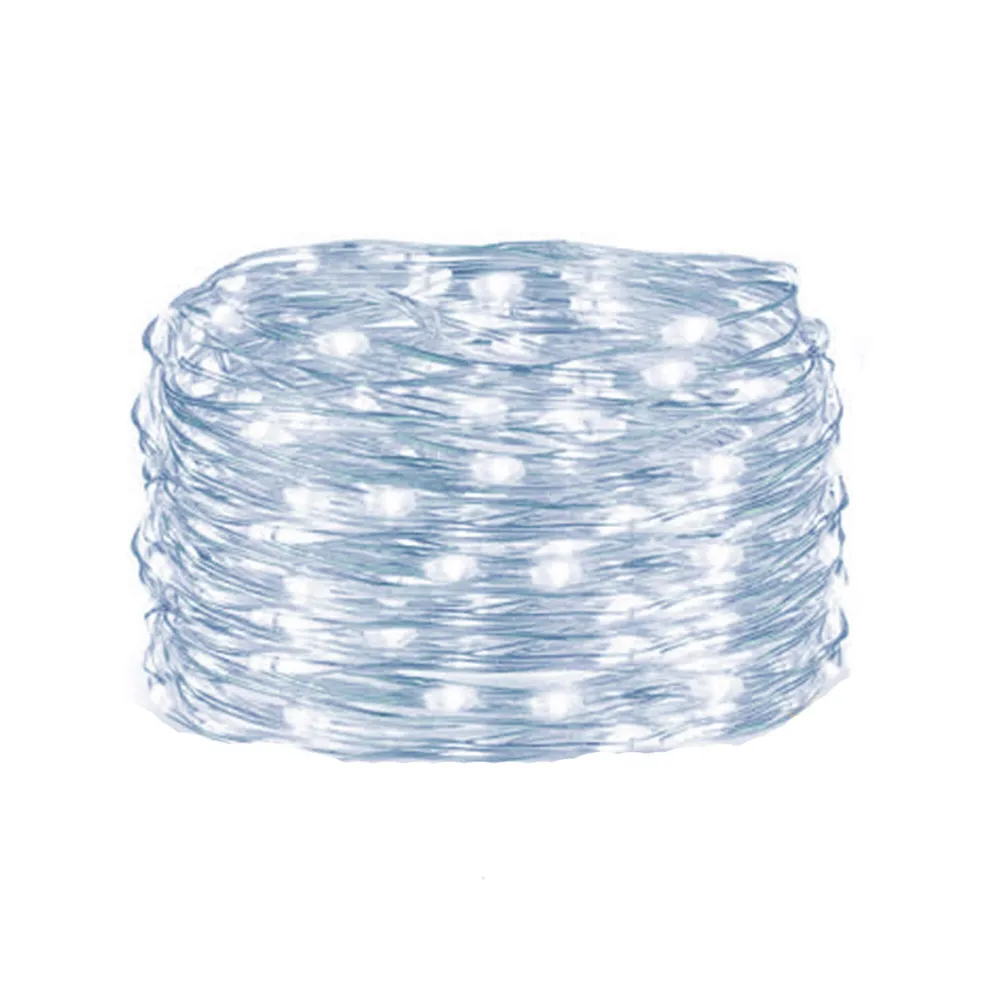 Ultratenká svetelná reťaz s napájaním na batérie. Dĺžka svetelnej časti 9,9 m, napájací kábel 30 cm, vnútorné použitie. Farba svetla studená biela, 100 LED, napájanie 3x AA batérie.