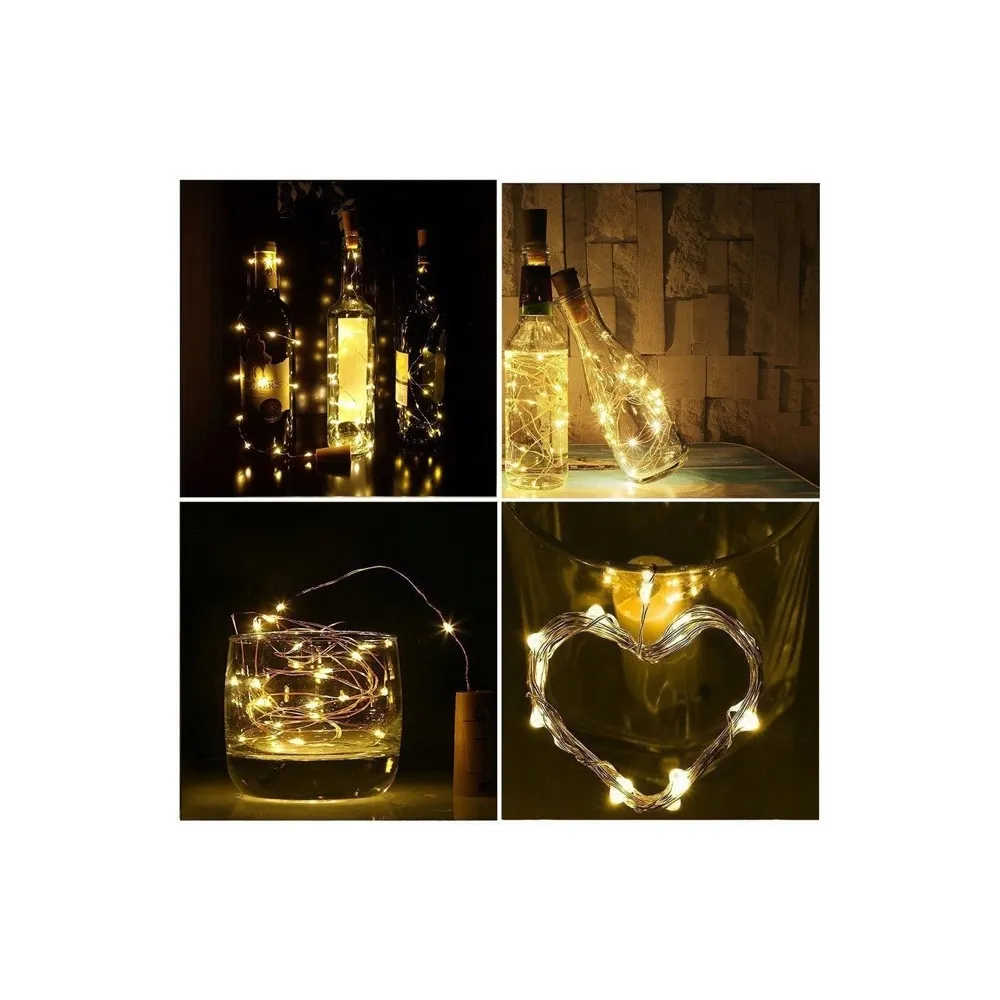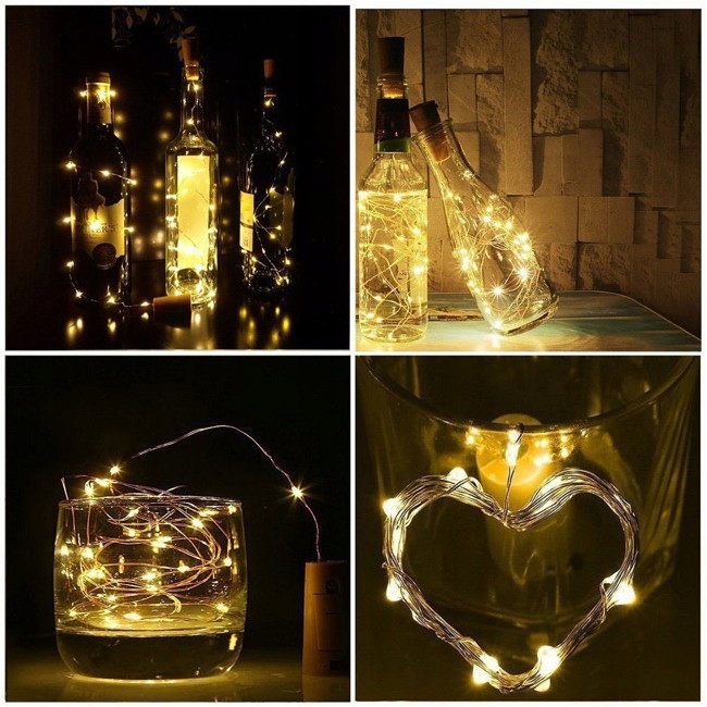 Ultratenká svetelná reťaz so špuntom od fľaše. Napájanie na batérie, dĺžka svetelnej časti 1,9 m, vnútorné použitie. Farba svetla teplá biela, 20 LED, napájanie 3x LR44 batérie.