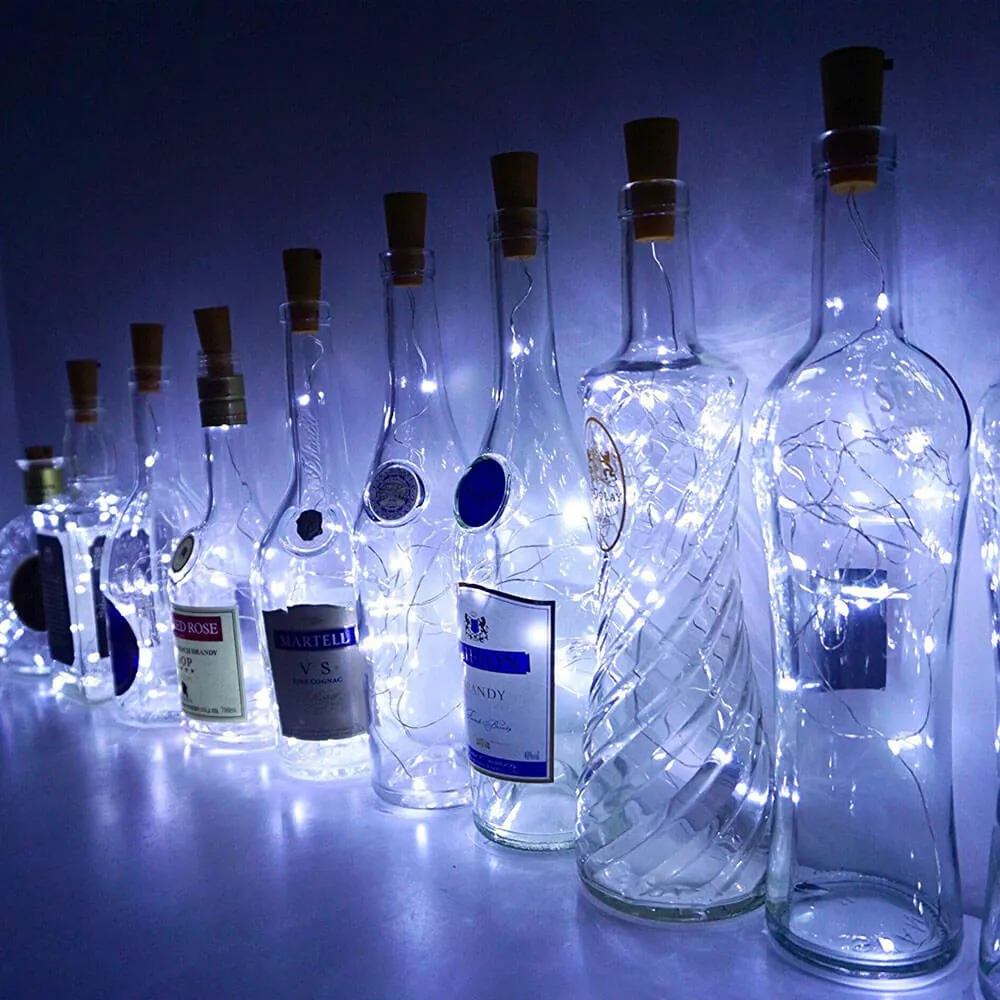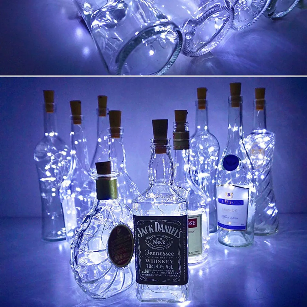 Ultratenká svetelná reťaz so špuntom od fľaše. Napájanie na batérie, dĺžka svetelnej časti 1,9 m, vnútorné použitie. Farba svetla studená biela, 20 LED, napájanie 3x LR44 batérie.
