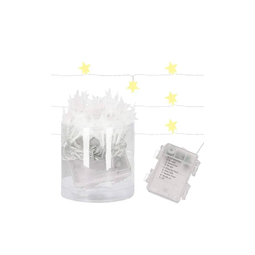 Svetelná reťaz s 50 hviezdičkami, 8 svetelnými funkciami a napájaním na batérie. Jemne presvieti okolie a vytvorí príjemnú sviatočnú atmosféru. Úsporné mikro diódy, vnútorné aj vonkajšie použitie. Vodeodolné prevedenie, krytie IP44. Dĺžka svetelnej časti 4,7 m, napájací kábel 30 cm, veľkosť hviezd 3,5 cm. Farba svetla teplá biela, 50 ľad, napájanie 3x AA batérie.