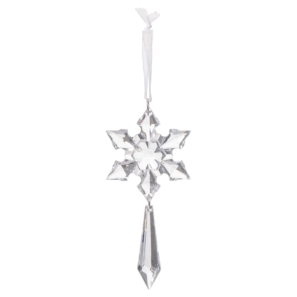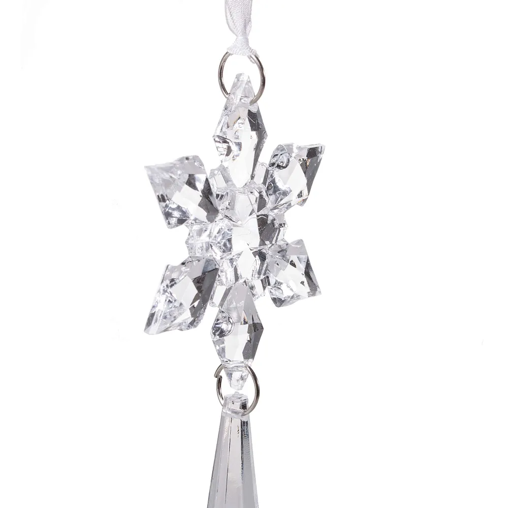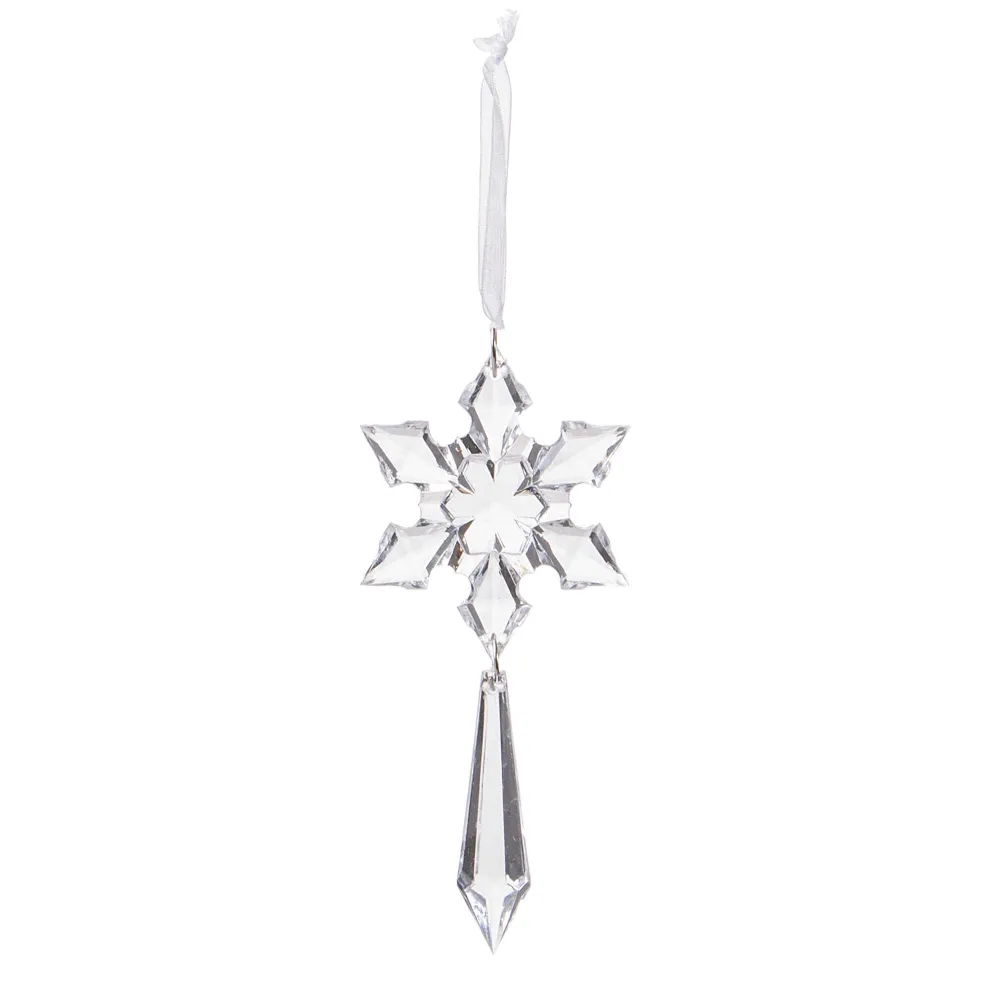 Dokonalá krištáľová vločka s cencúľom a špagátom na zavesenie. Výška 13 cm, nerozbitný, akrylátový materiál. Ideálne na výzdobu stromčekov alebo ako vianočné dekorácie.
