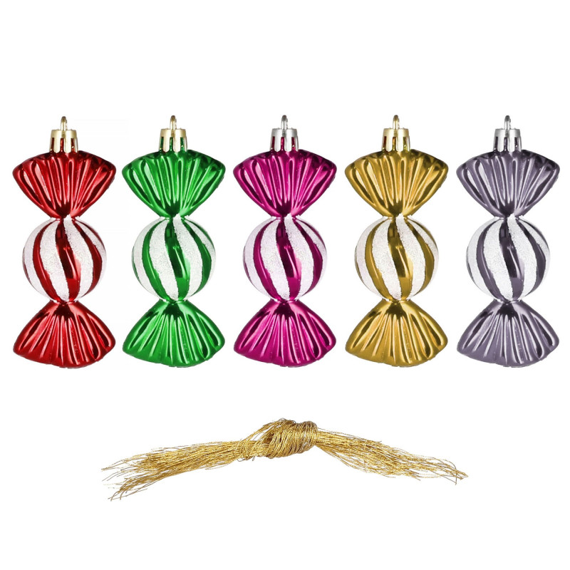 Súprava 5 ks farebných ozdôb na stromček s motívom prekrásne zabalených cukroviniek. Výška ozdoby 5 cm, zdobené trblietkami, pútko na zavesenie, nerozbitný plastový materiál. Ideálne na výzdobu stromčeka alebo ako vianočné dekorácie. Zadarmo povrázky pre ľahké zavesenie.