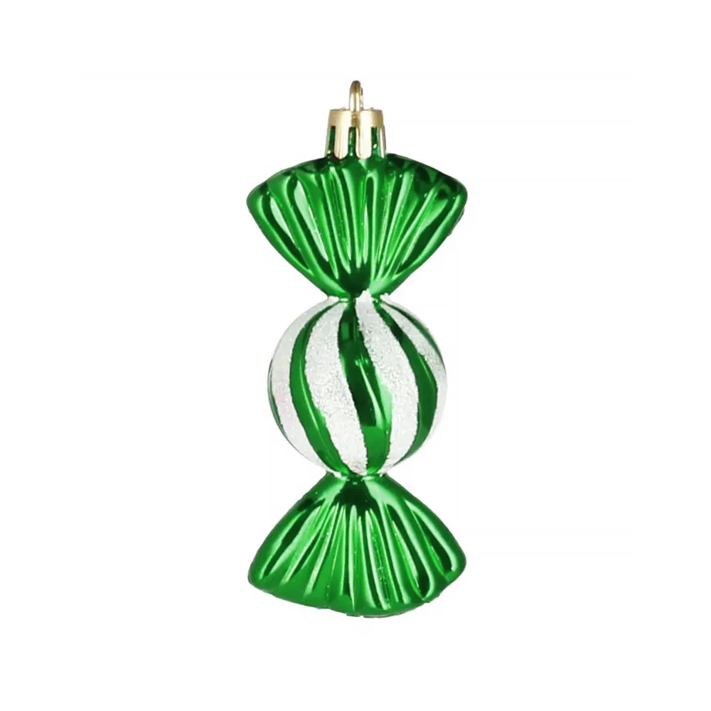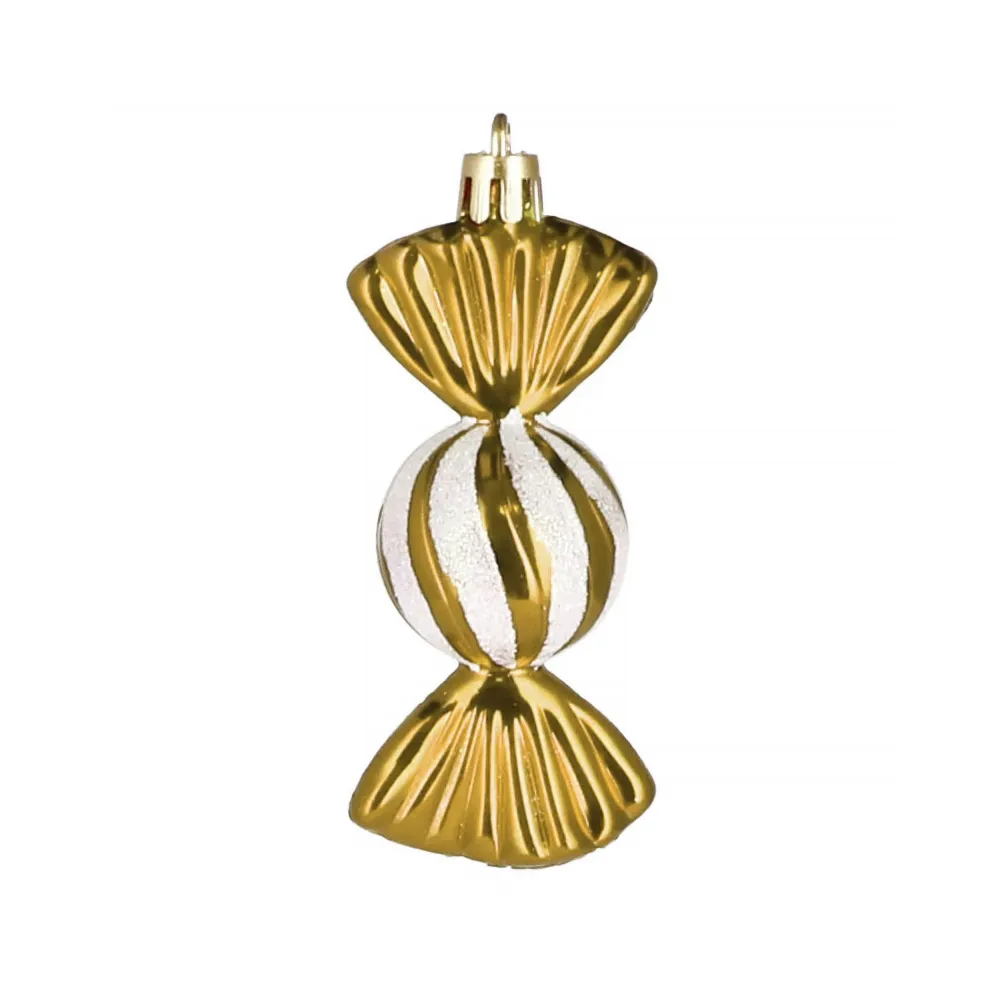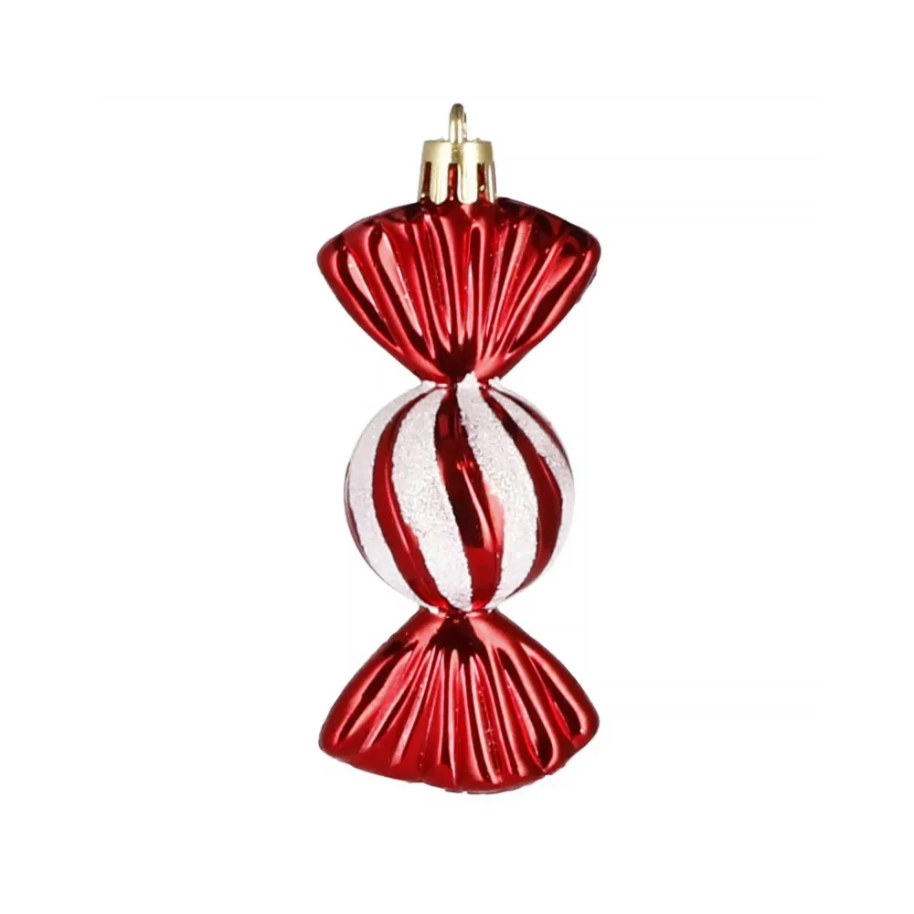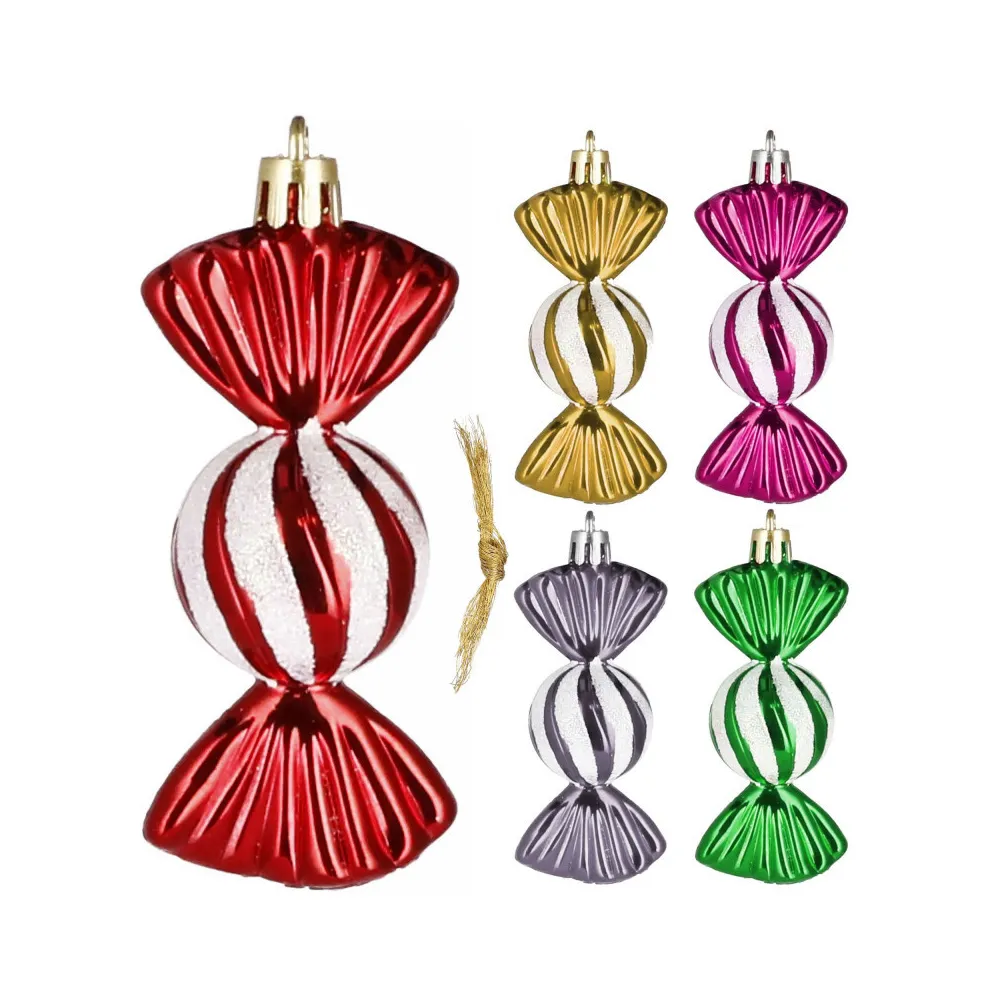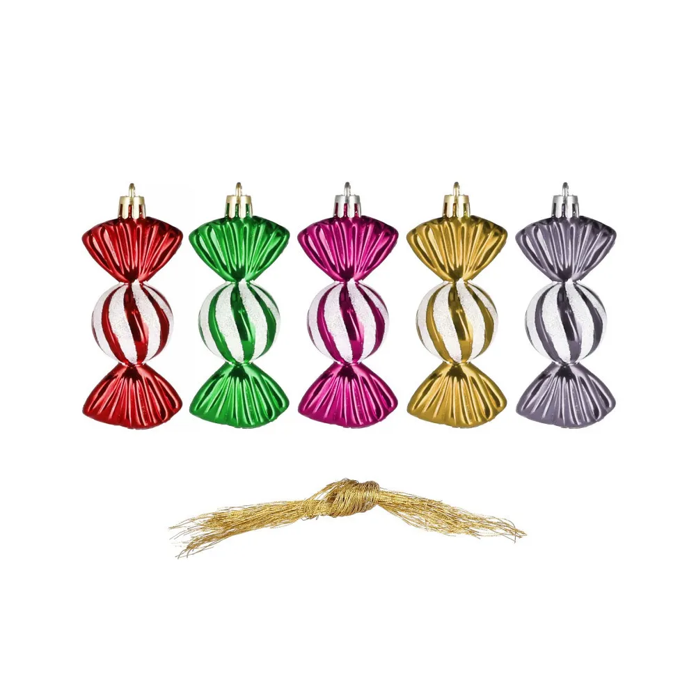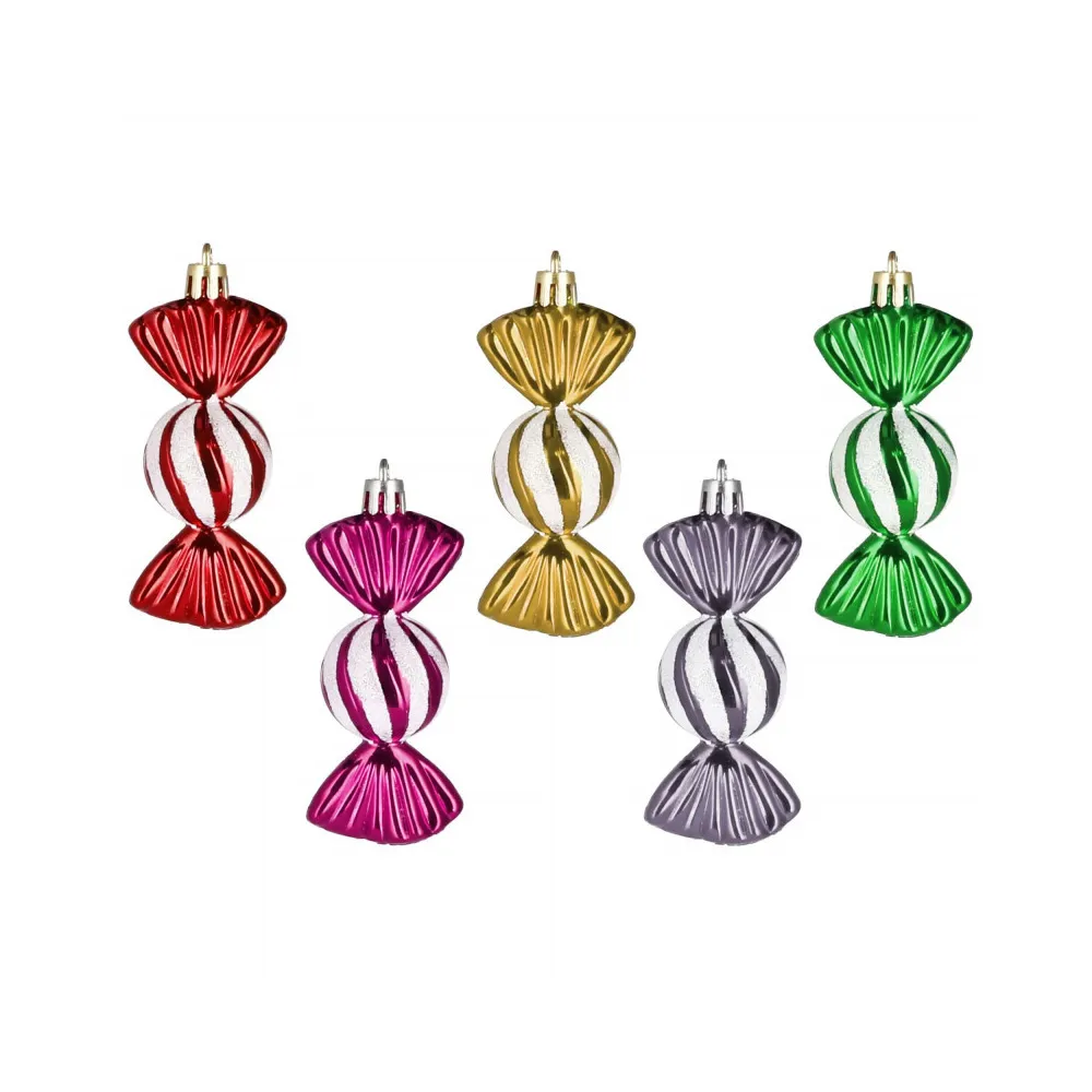 Súprava 5 ks farebných ozdôb na stromček s motívom prekrásne zabalených cukroviniek. Výška ozdoby 5 cm, zdobené trblietkami, pútko na zavesenie, nerozbitný plastový materiál. Ideálne na výzdobu stromčeka alebo ako vianočné dekorácie. Zadarmo povrázky pre ľahké zavesenie.