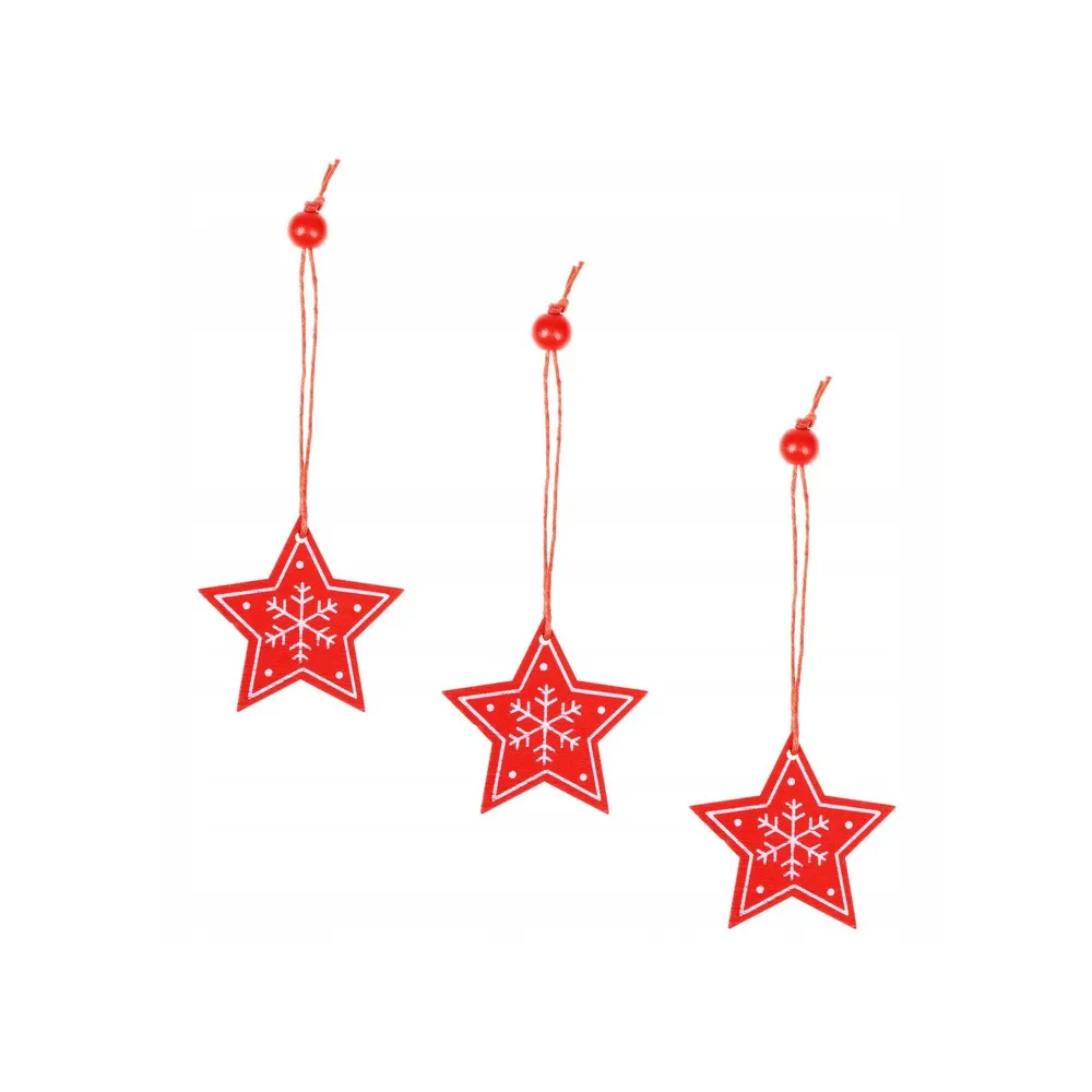 Súprava troch kusov drevených hviezd s bielymi vločkami a špagátom na zavesenie. Výška 4,5 cm, prírodný materiál. Ideálne na výzdobu stromčekov alebo ako vianočné dekorácie.
