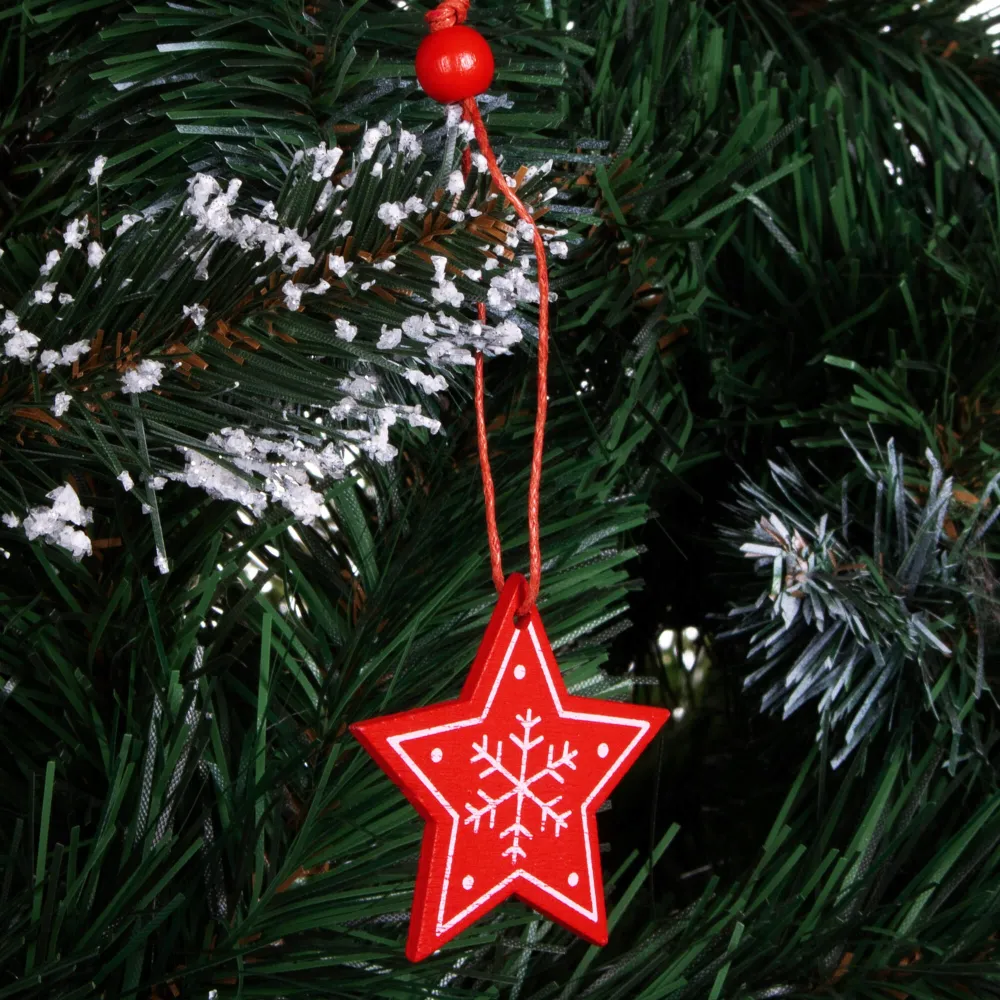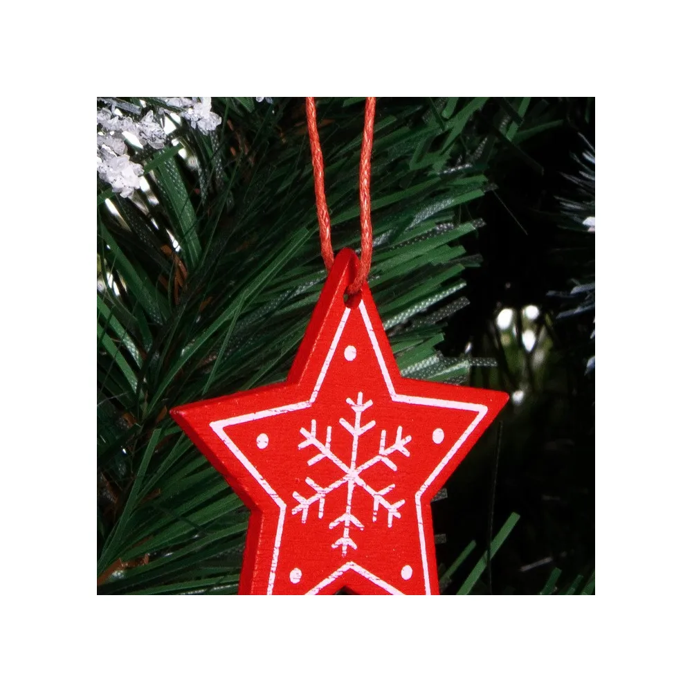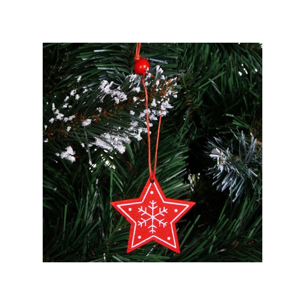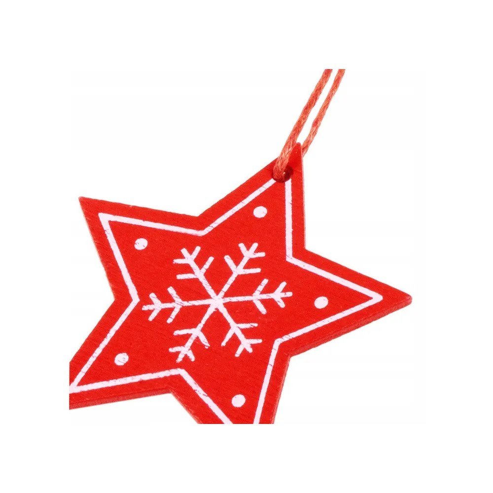 Súprava troch kusov drevených hviezd s bielymi vločkami a špagátom na zavesenie. Výška 4,5 cm, prírodný materiál. Ideálne na výzdobu stromčekov...