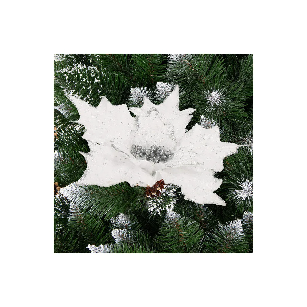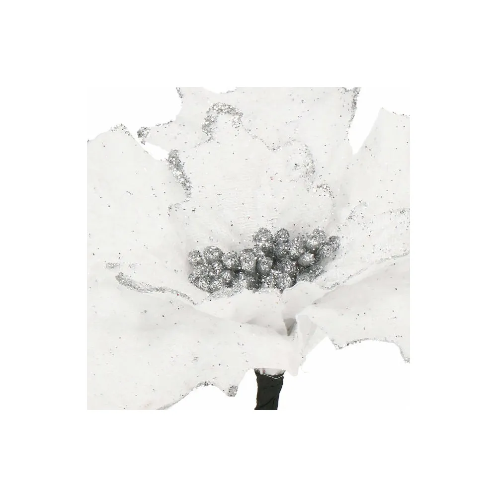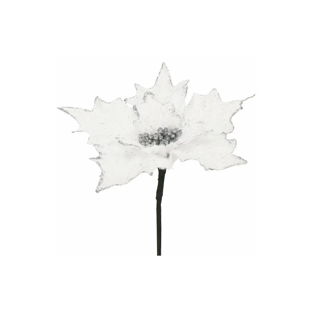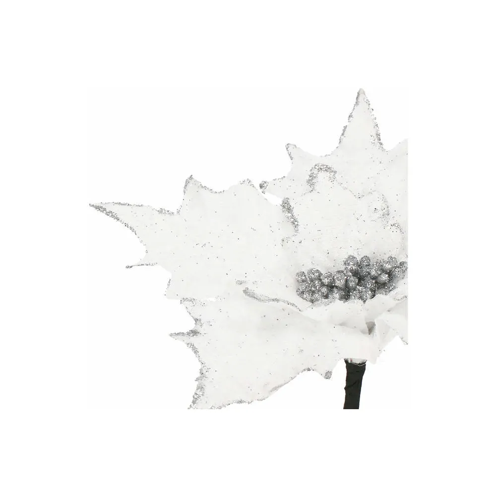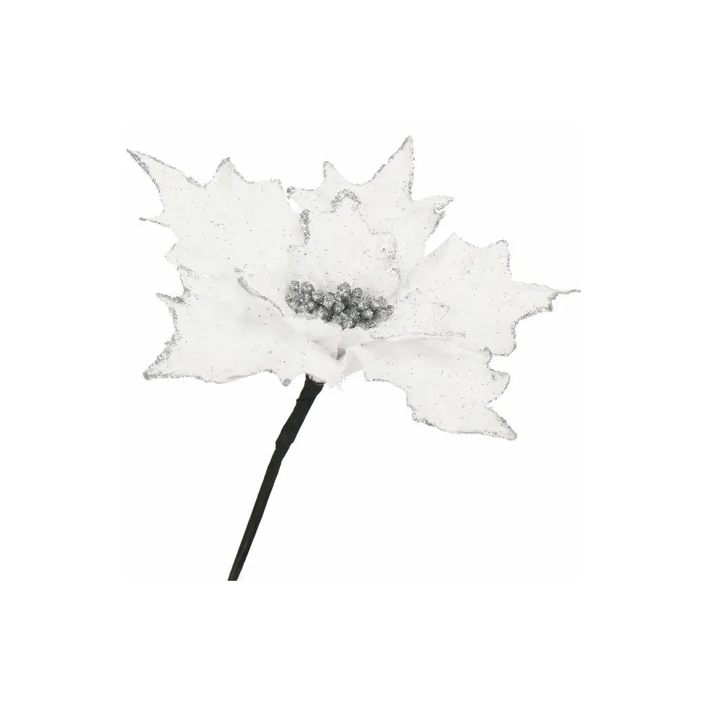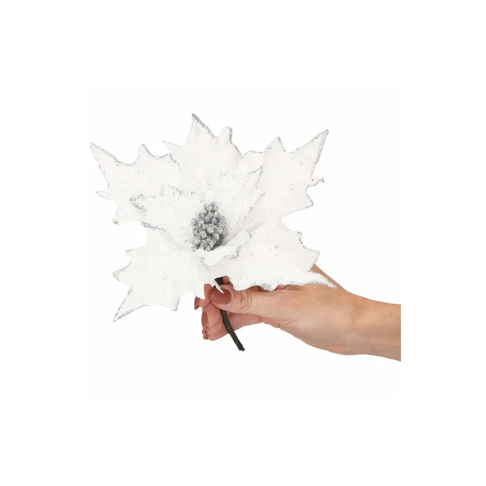 Umelá vianočná hviezda na stonke očarí svojim jemným leskom a realistickým spracovaním. Vďaka ohybnej stonke je vhodná do rôznych vianočných aranžmánov, na výzdobu stromčeka alebo ako samostatná dekorácia. Priemer kvetu 28 cm, dĺžka so stonkou 23 cm, biela farba.