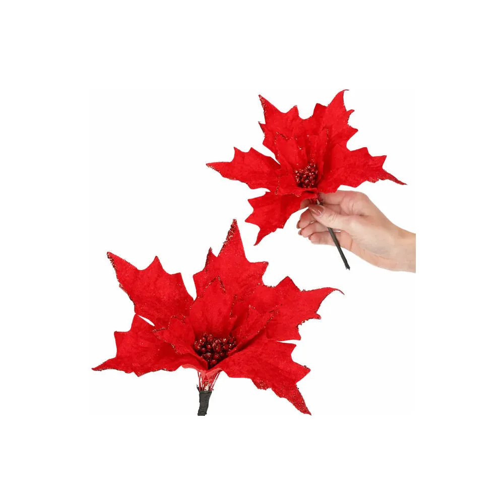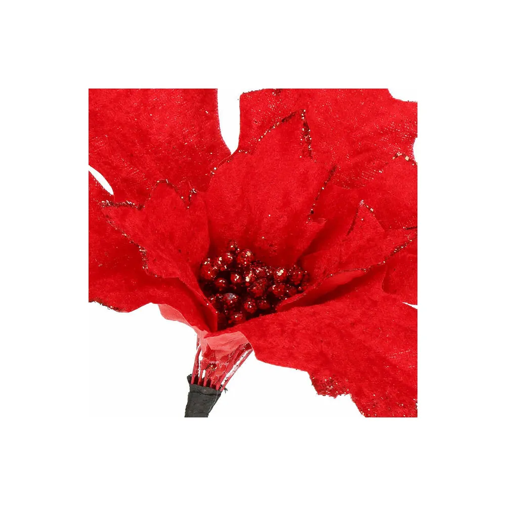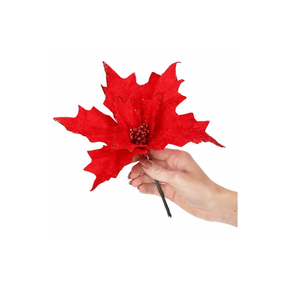 Umelá vianočná hviezda na stonke očarí svojim jemným leskom a realistickým spracovaním. Vďaka ohybnej stonke je vhodná do rôznych vianočných aranžmánov, na výzdobu stromčeka alebo ako samostatná dekorácia. Priemer kvetu 24 cm, dĺžka so stonkou 15 cm, červená farba.