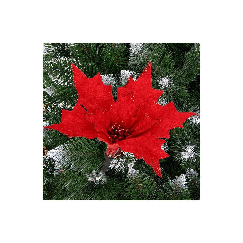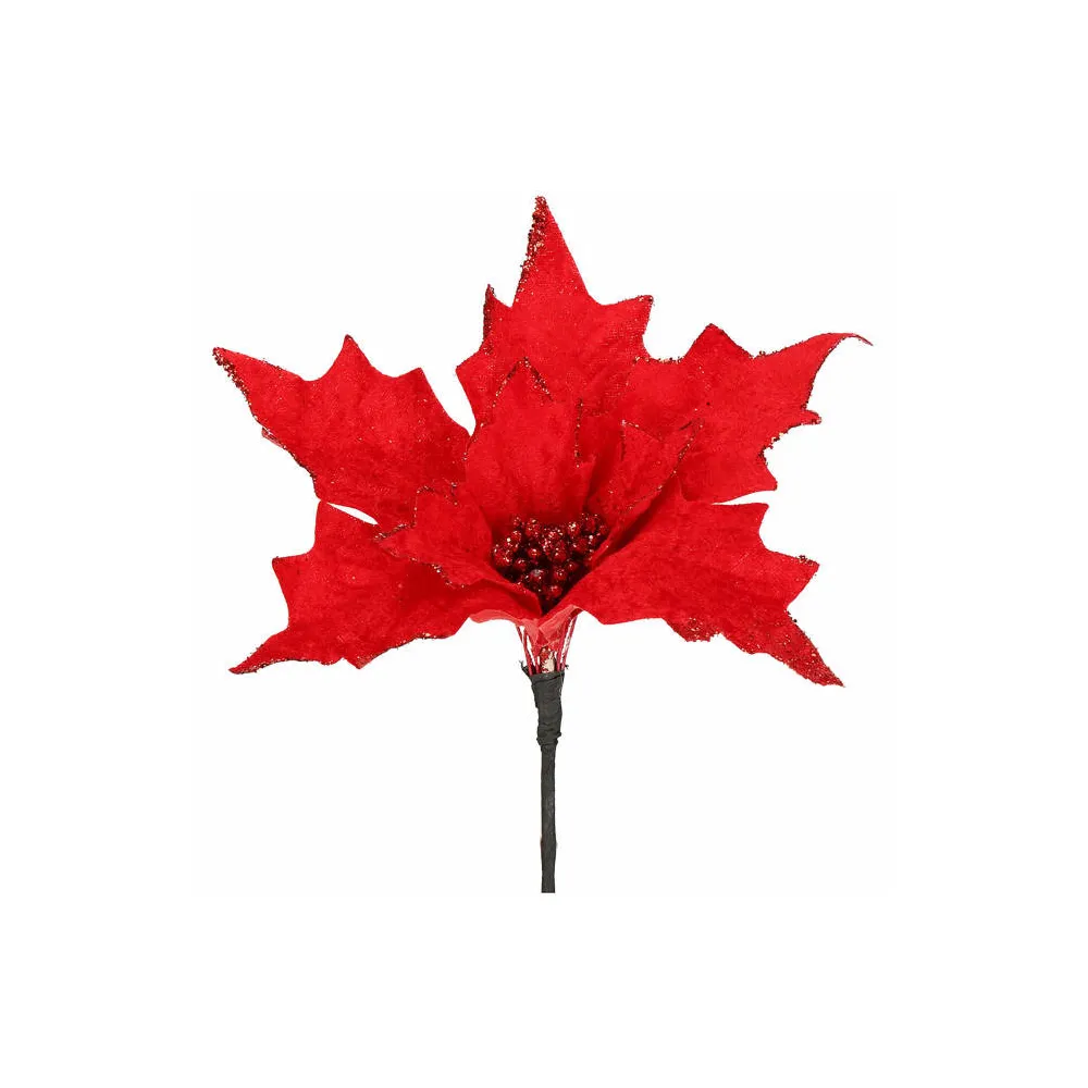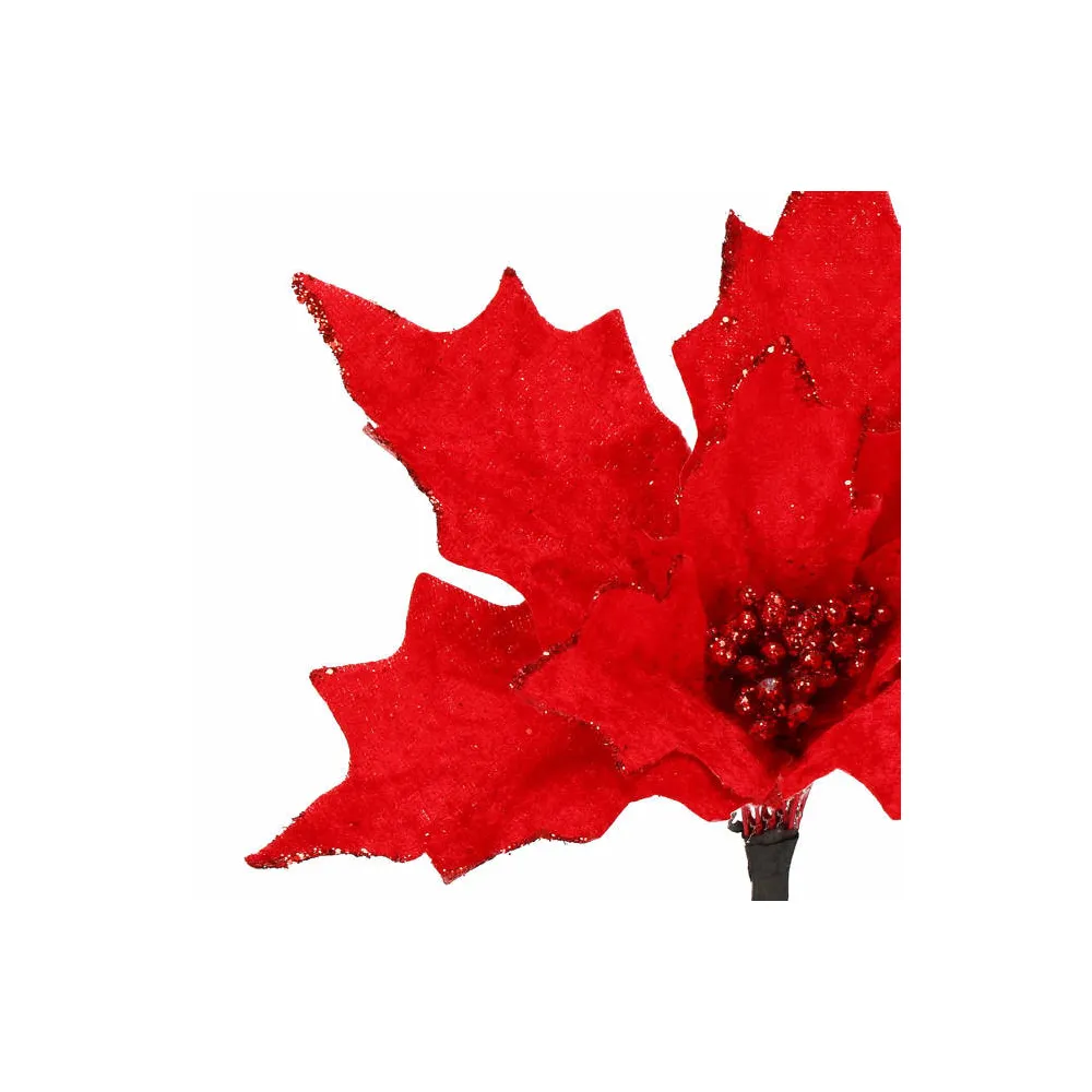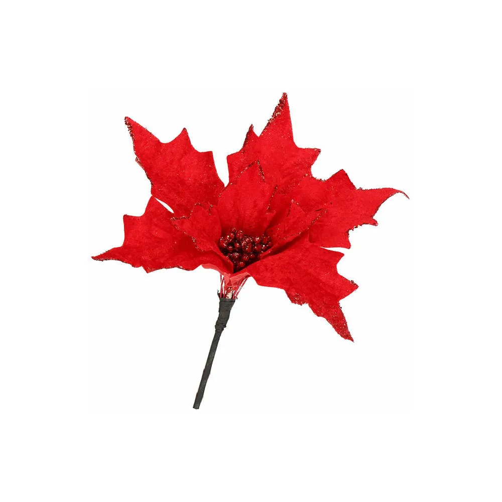 Umelá vianočná hviezda na stonke očarí svojim jemným leskom a realistickým spracovaním. Vďaka ohybnej stonke je vhodná do rôznych vianočných aranžmánov, na výzdobu stromčeka alebo ako samostatná dekorácia. Priemer kvetu 24 cm, dĺžka so stonkou 15 cm, červená farba.