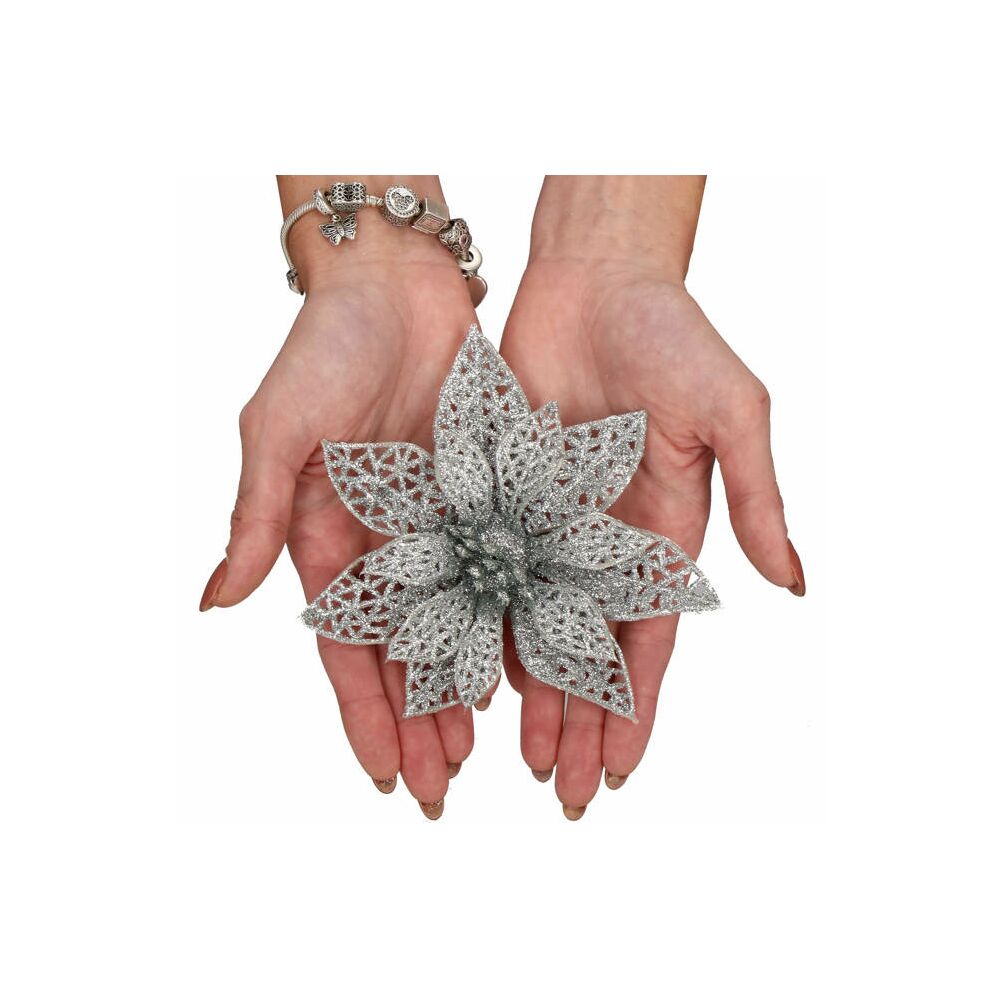 Umelá vianočná hviezda s klipom dokonale doplní vianočnú výzdobu. Detailne prelamovaný kvet s trblietkami a umelým snehom vytvára jedinečný efekt námrazy. Vďaka spodnému klipu sa ľahko pripevňuje. Veľkosť 10x10 cm, strieborná farba.