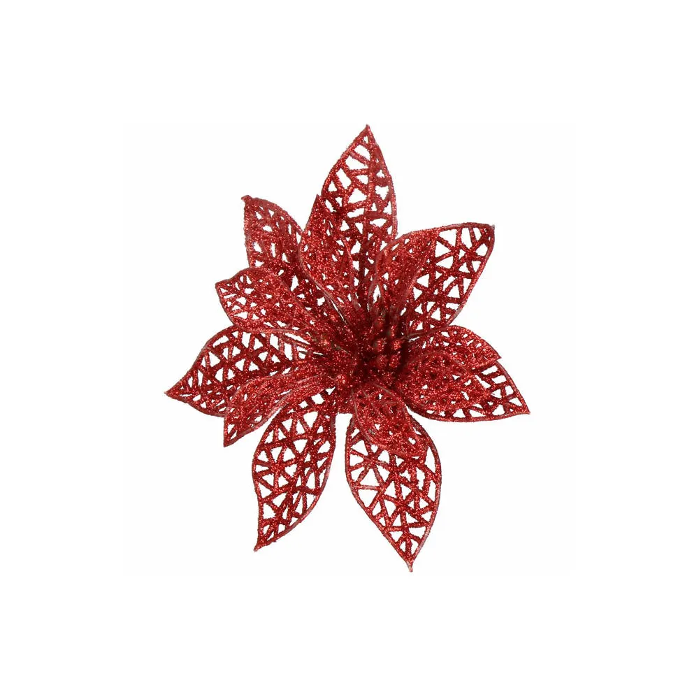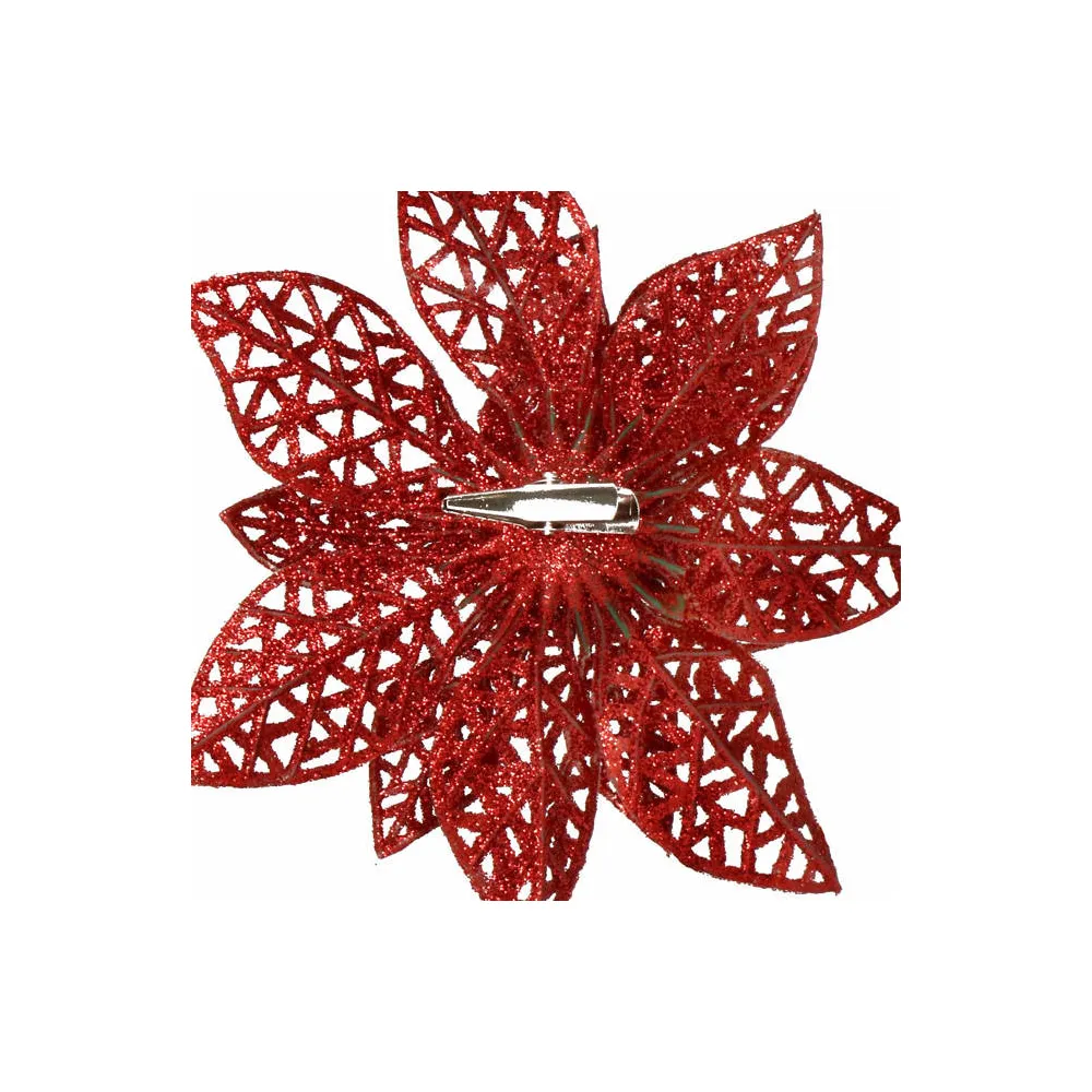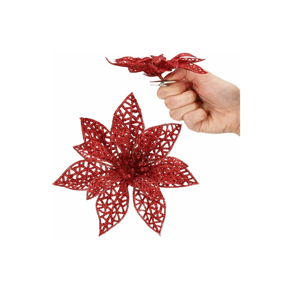 Umelá vianočná hviezda s klipom dokonale doplní vianočnú výzdobu. Detailne prelamovaný kvet s trblietkami a umelým snehom vytvára jedinečný efekt námrazy. Vďaka spodnému klipu sa ľahko pripevňuje. Veľkosť 9x9 cm, červená farba.