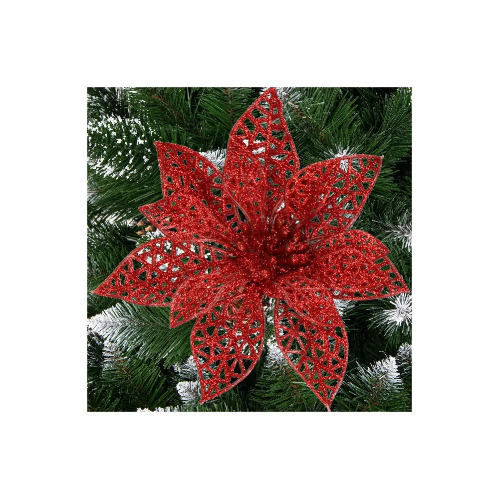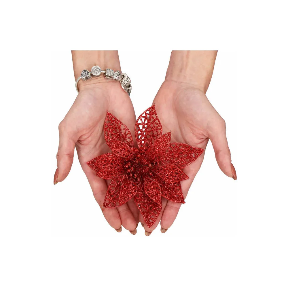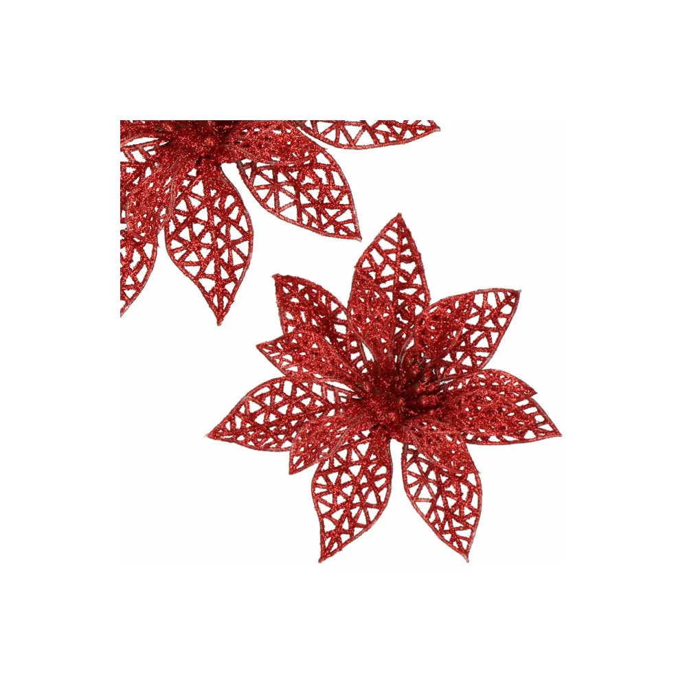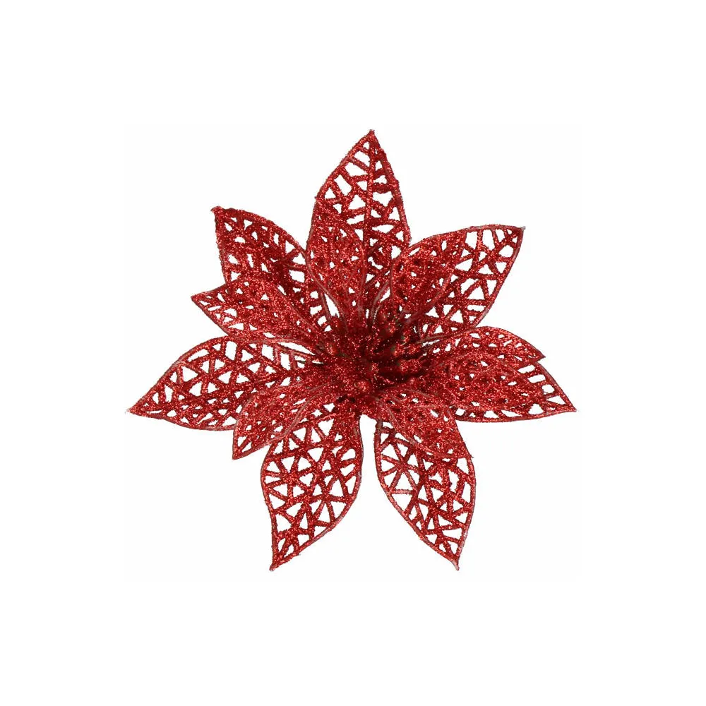 Umelá vianočná hviezda s klipom dokonale doplní vianočnú výzdobu. Detailne prelamovaný kvet s trblietkami a umelým snehom vytvára jedinečný efekt námrazy. Vďaka spodnému klipu sa ľahko pripevňuje. Veľkosť 9x9 cm, červená farba.