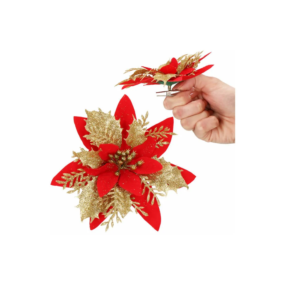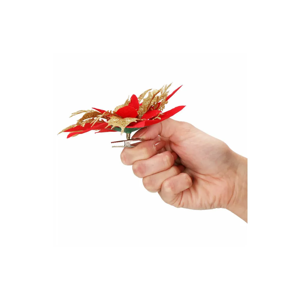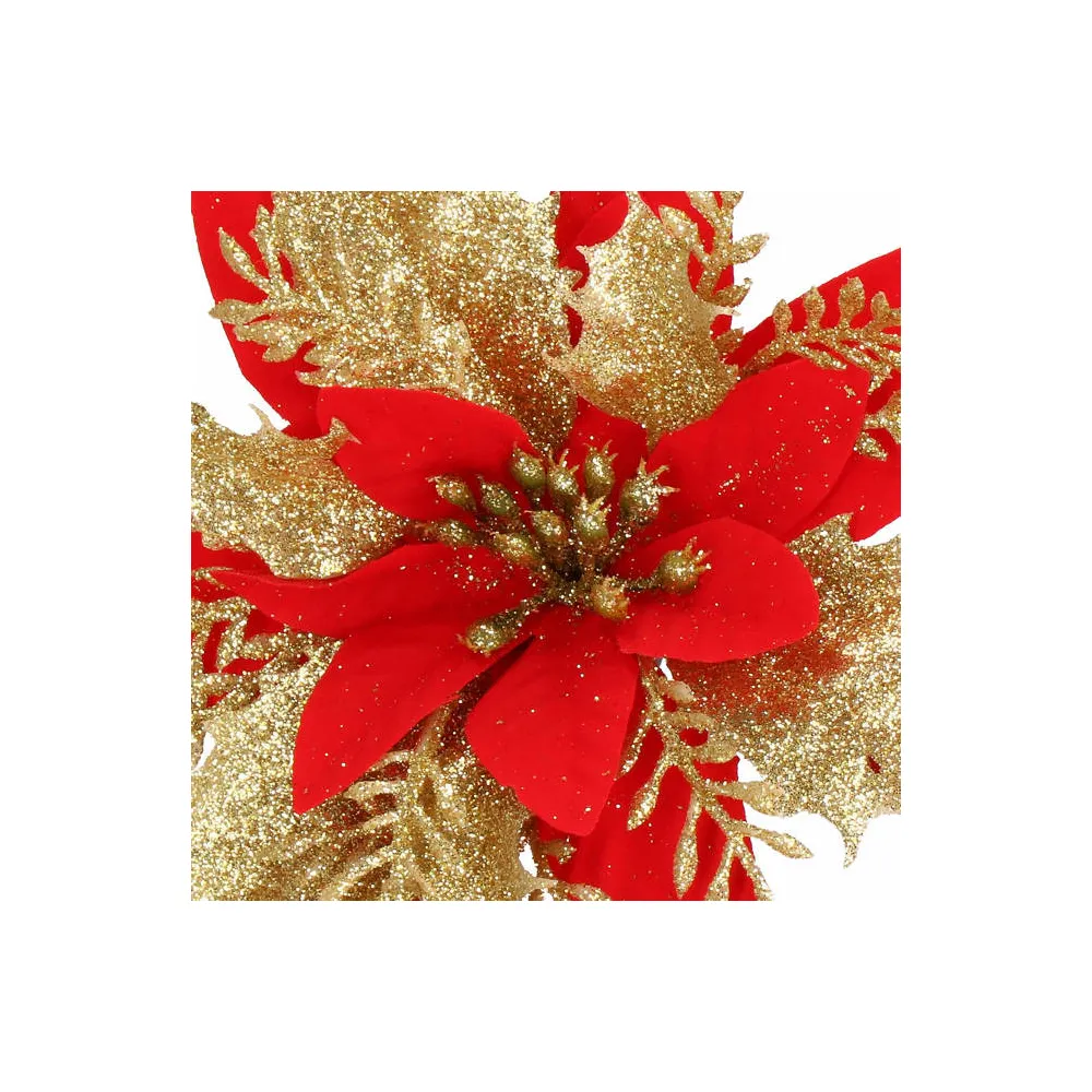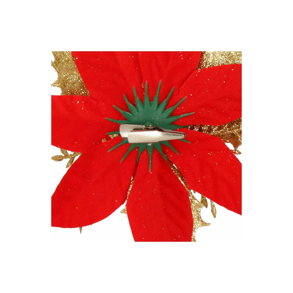 Umelá vianočná hviezda zdobená zlatými lístkami zaručene navodí sviatočnú atmosféru. Prekrásna dekorácia pokrytá trblietkami, ktoré ju vo svetlách takmer magicky rozžiaria. Pomocou spodného klipu sa ľahko pripevňuje. Veľkosť 13x13 cm, zlato-červená farba.
