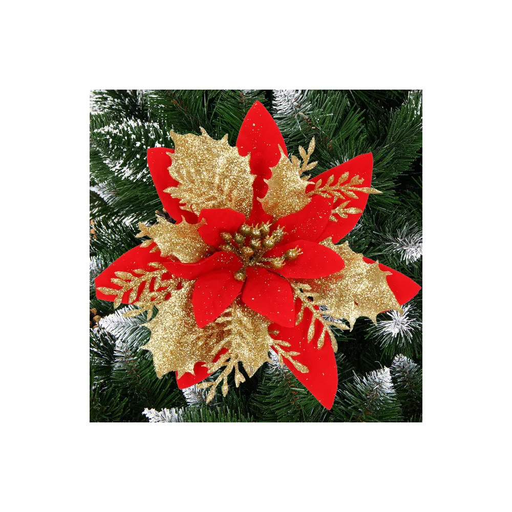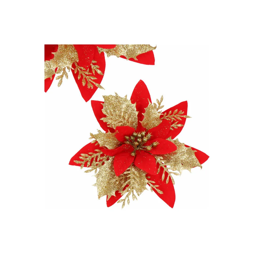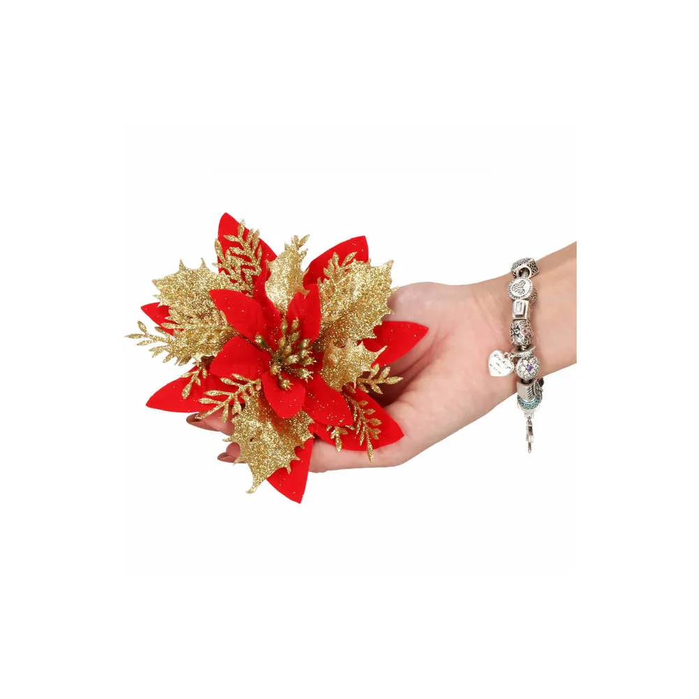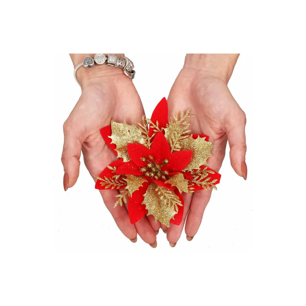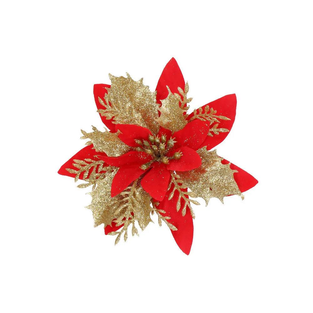 Umelá vianočná hviezda zdobená zlatými lístkami zaručene navodí sviatočnú atmosféru. Prekrásna dekorácia pokrytá trblietkami, ktoré ju vo svetlách takmer magicky rozžiaria. Pomocou spodného klipu sa ľahko pripevňuje. Veľkosť 13x13 cm, zlato-červená farba.