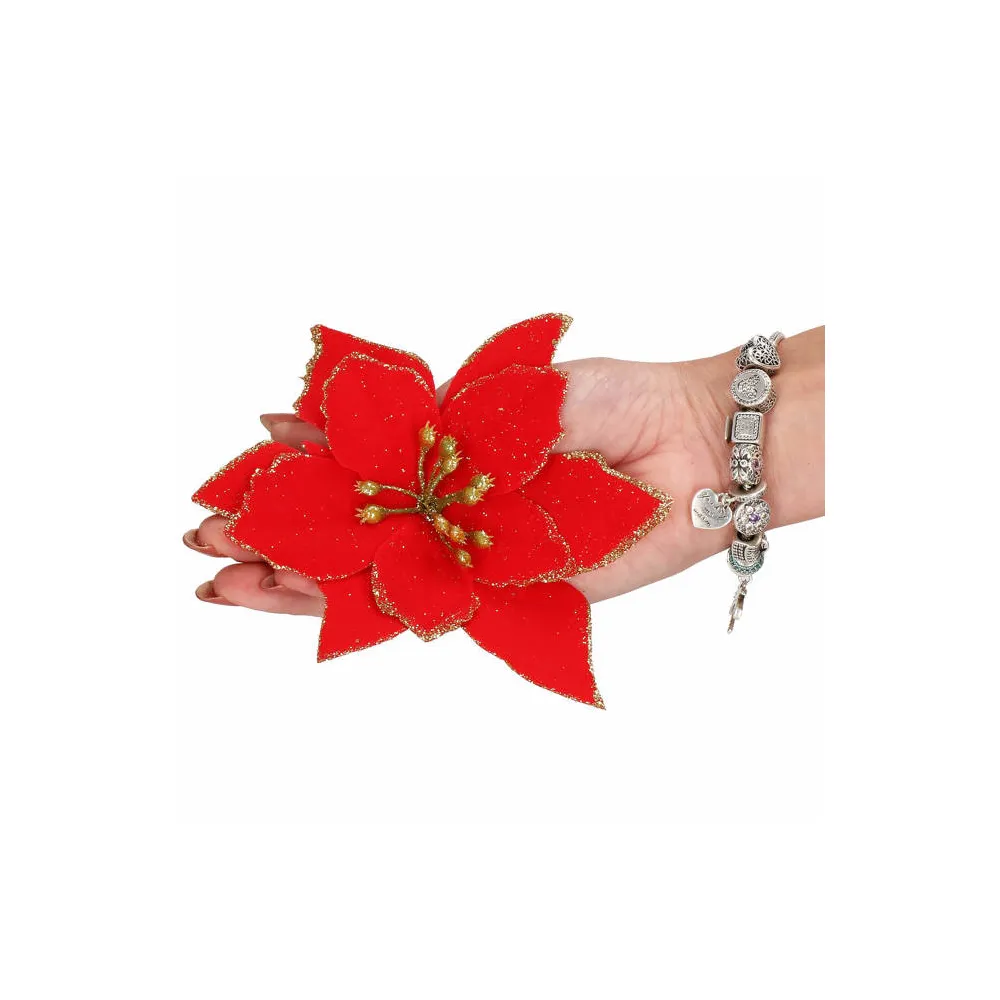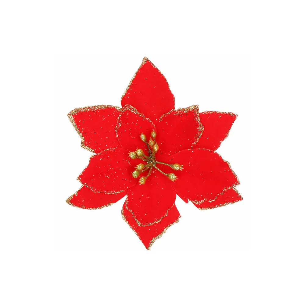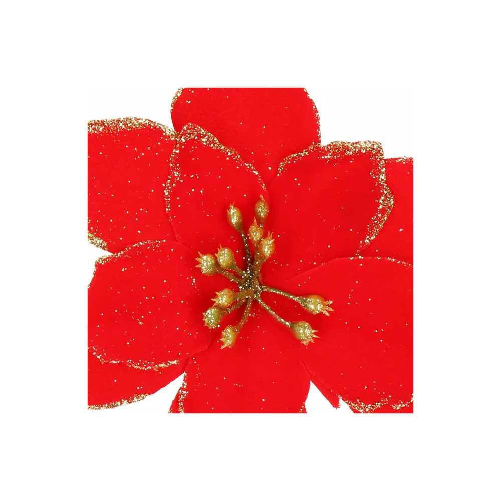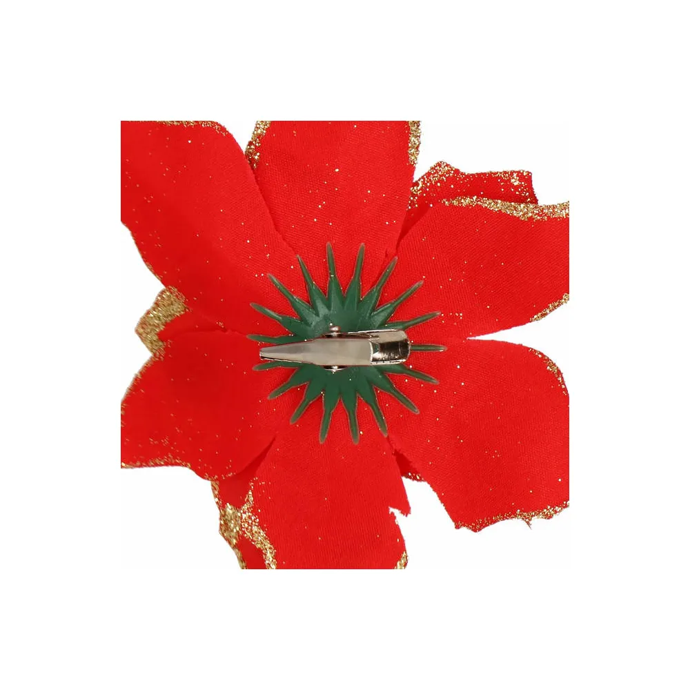 Umelá vianočná hviezda so zlatým lemovaním okvetných lístkov. Prekrásna dekorácia pokrytá trblietkami, ktoré ju vo svetlách takmer magicky rozžiaria. Pomocou spodného klipu sa ľahko pripevňuje. Veľkosť 13x13 cm, červená farba.