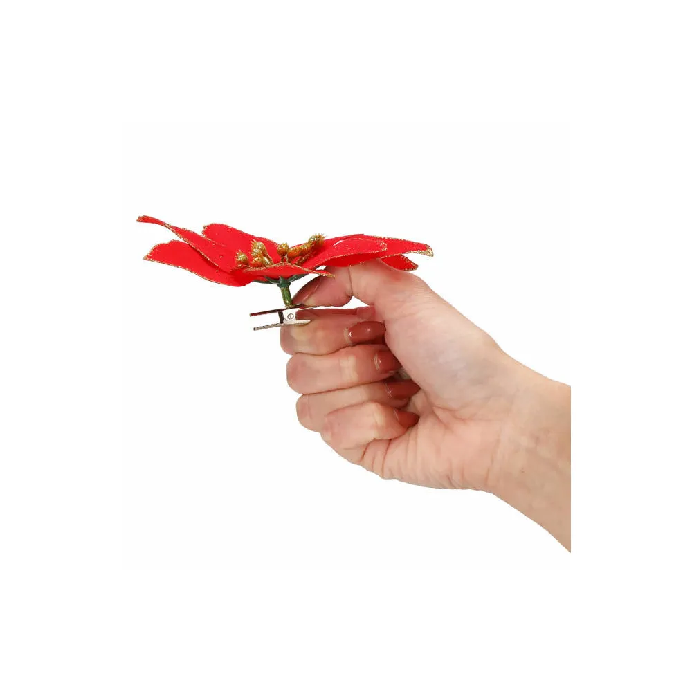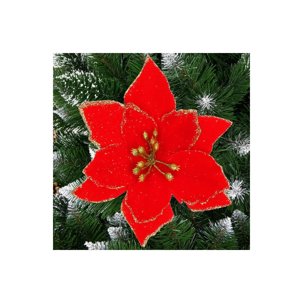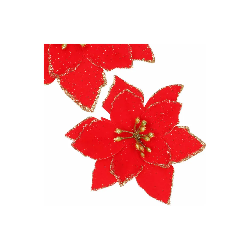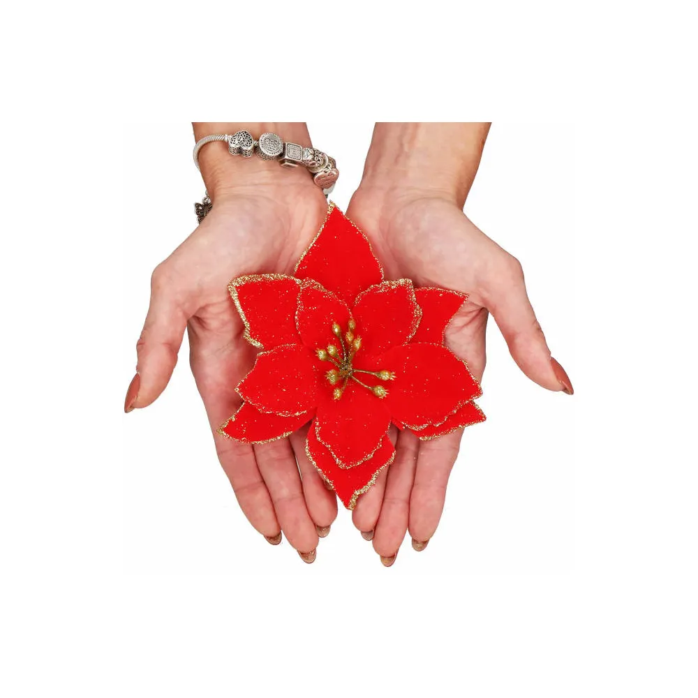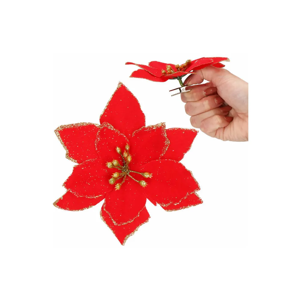 Umelá vianočná hviezda so zlatým lemovaním okvetných lístkov. Prekrásna dekorácia pokrytá trblietkami, ktoré ju vo svetlách takmer magicky rozžiaria. Pomocou spodného klipu sa ľahko pripevňuje. Veľkosť 13x13 cm, červená farba.