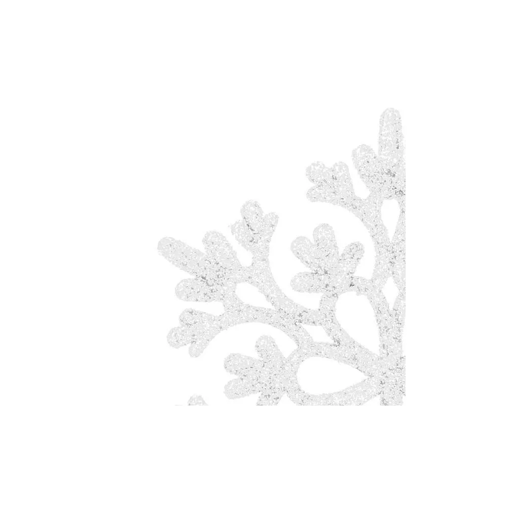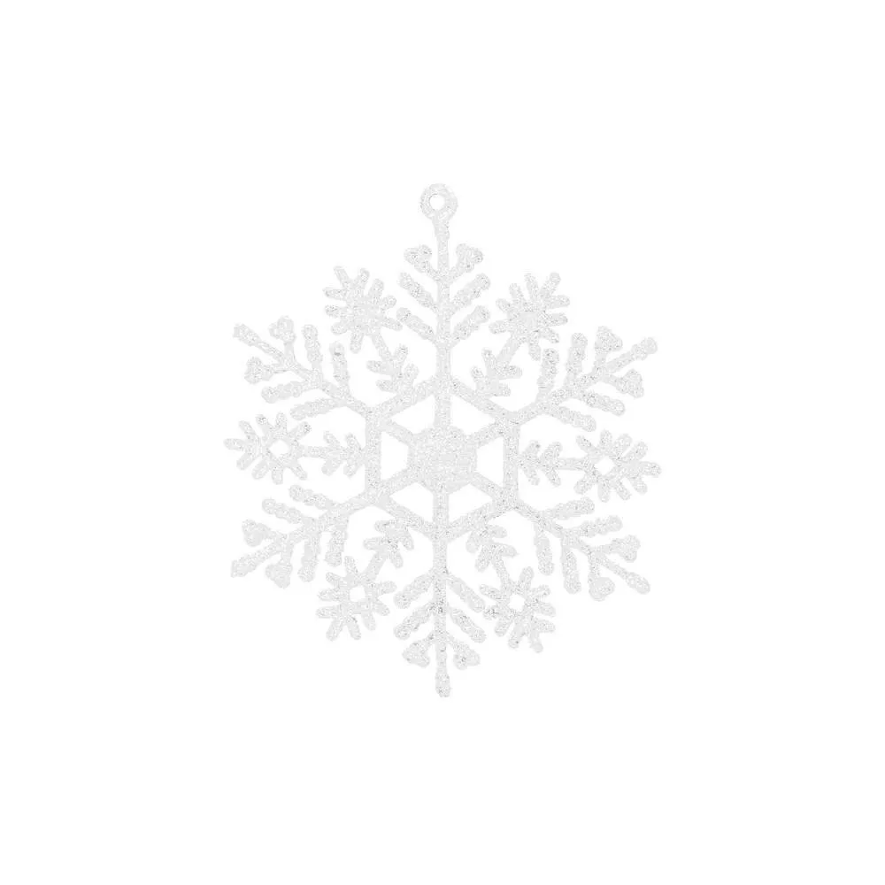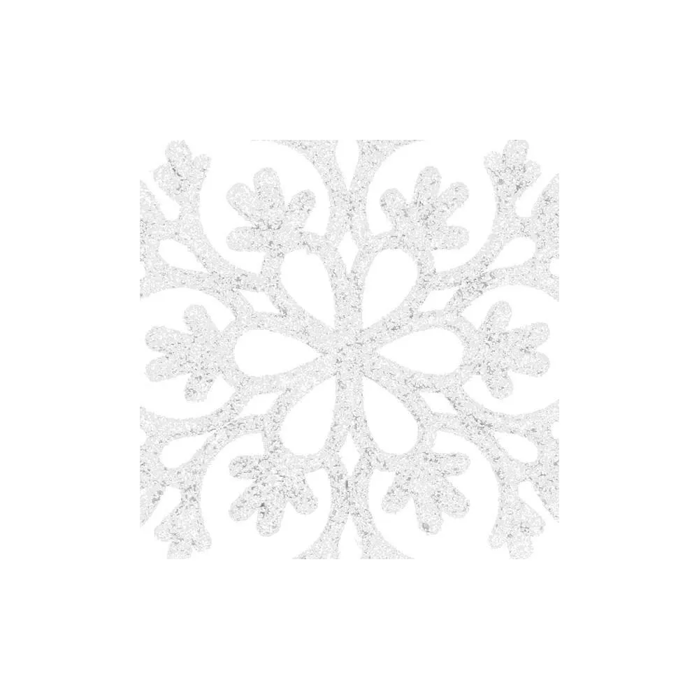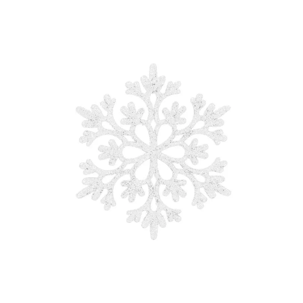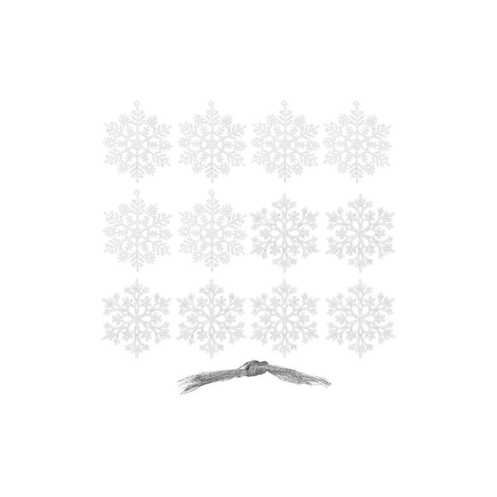 Súprava dvanástich kusov snehových vločiek so špagátom na zavesenie. Výška 10 cm, dva vzory vločiek, blýskavý povrch s trblietkami, nerozbitný plastový materiál, snehovo biela farba. Ideálne na výzdobu stromčekov alebo ako vianočné dekorácie.