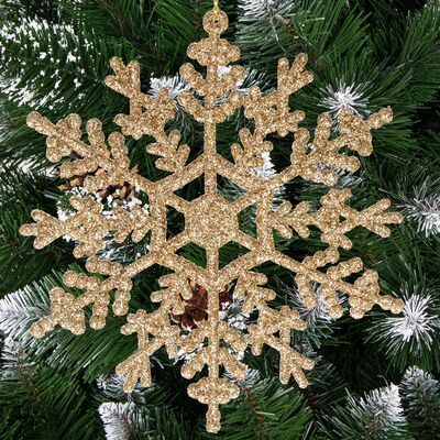 Súprava troch kusov snehových vločiek so špagátom na zavesenie. Výška 12 cm, blýskavý povrch s trblietkami, nerozbitný plastový materiál, zlatá farba. Ideálne na výzdobu stromčekov alebo ako vianočné dekorácie.