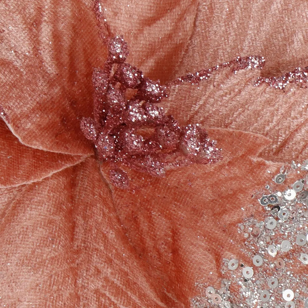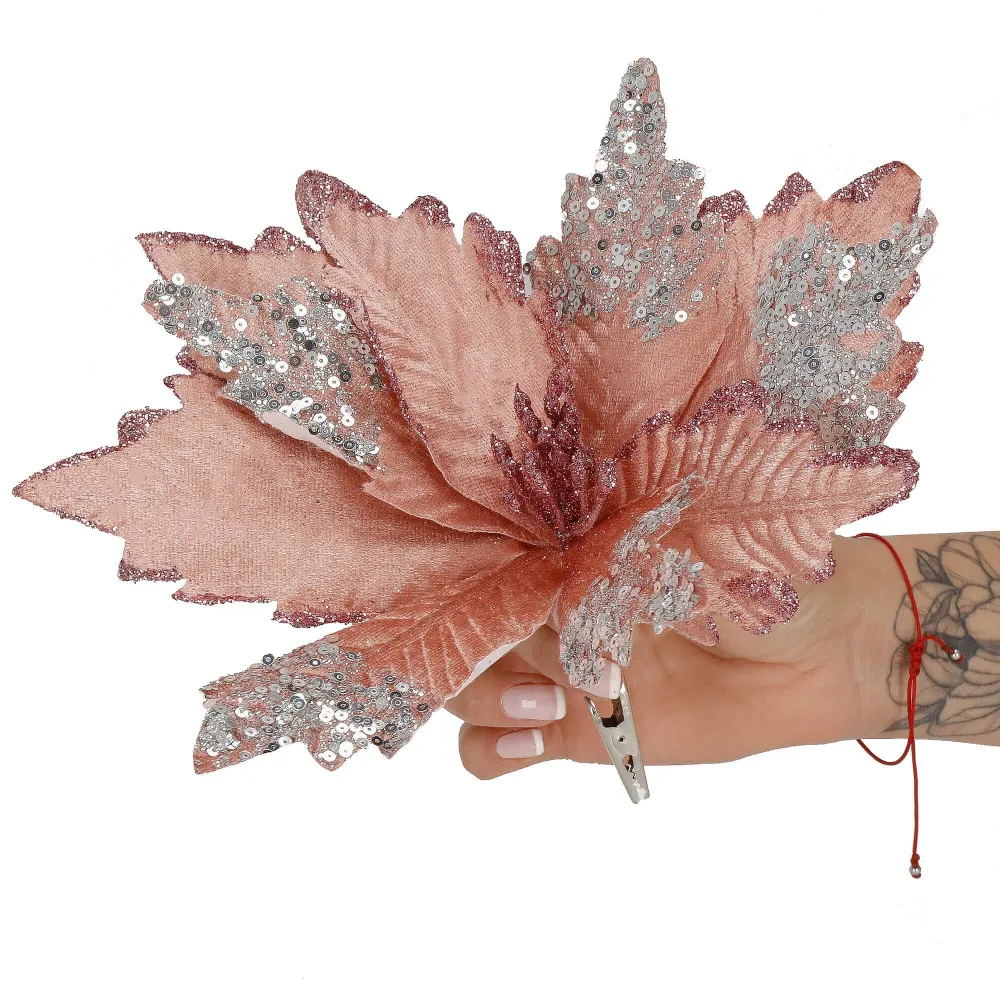 Umelý kvet vianočnej ruže s okvetnými lístkami zdobenými trblietkami a flitrami. Realistické spracovanie, stonka zakončená klipom pre ľahké pripevnenie do rôznych vianočných aranžmánov. Skvele sa tiež hodí ako ozdoba stromčeka alebo ako samostatná dekorácia. Veľkosť 26x21 cm, ružová farba.