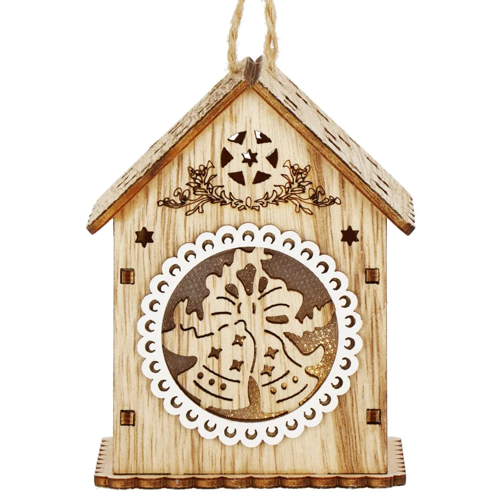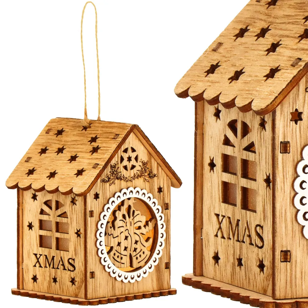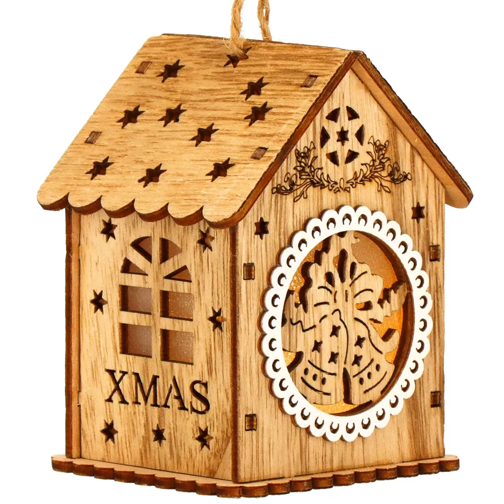 Táto nádherná vianočná ozdoba je vyrobená z kvalitného dreva a očarí svojim detailným rezbárskym spracovaním s motívom domčeka . Ozdoba je vybavená jemným vnútorným osvetlením , ktoré vytvára teplú a príjemnú žiaru, čím oživí akýkoľvek vianočný stromček či dekoráciu.