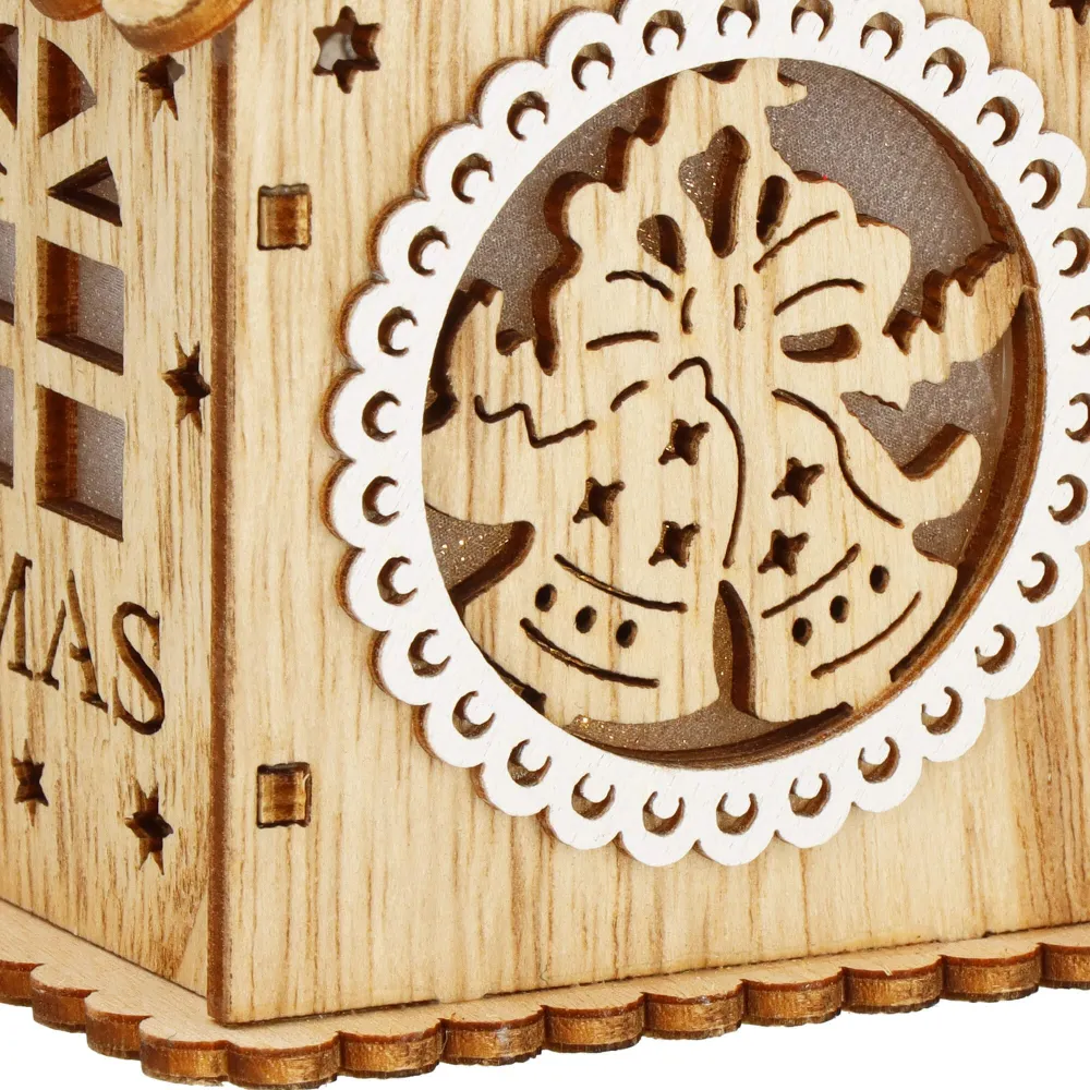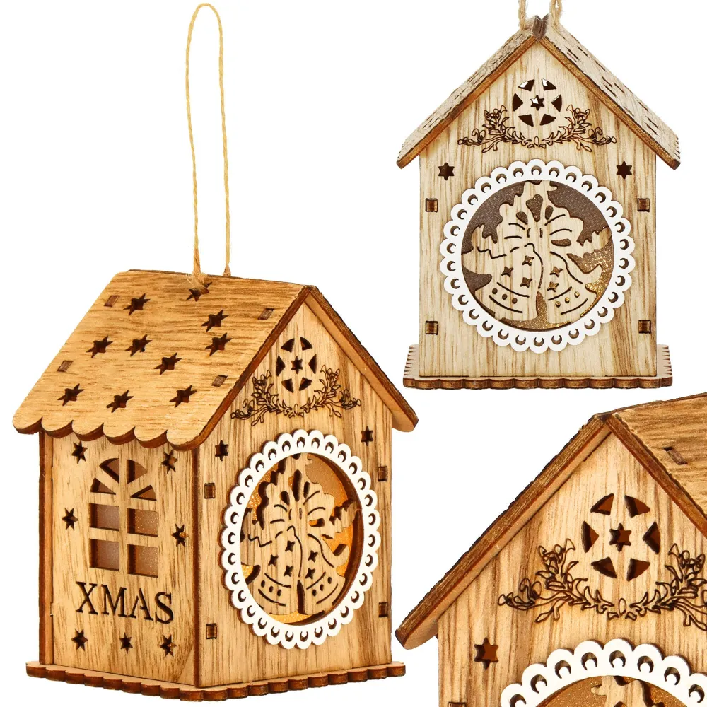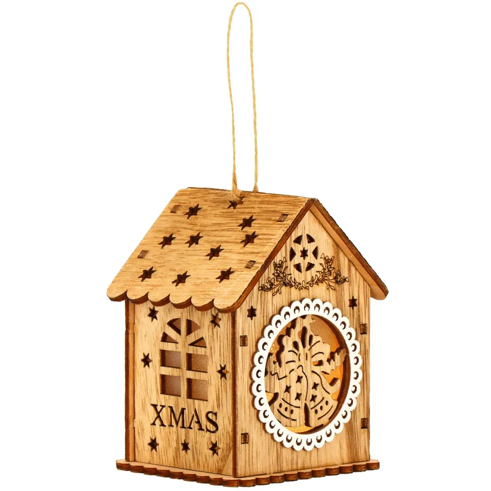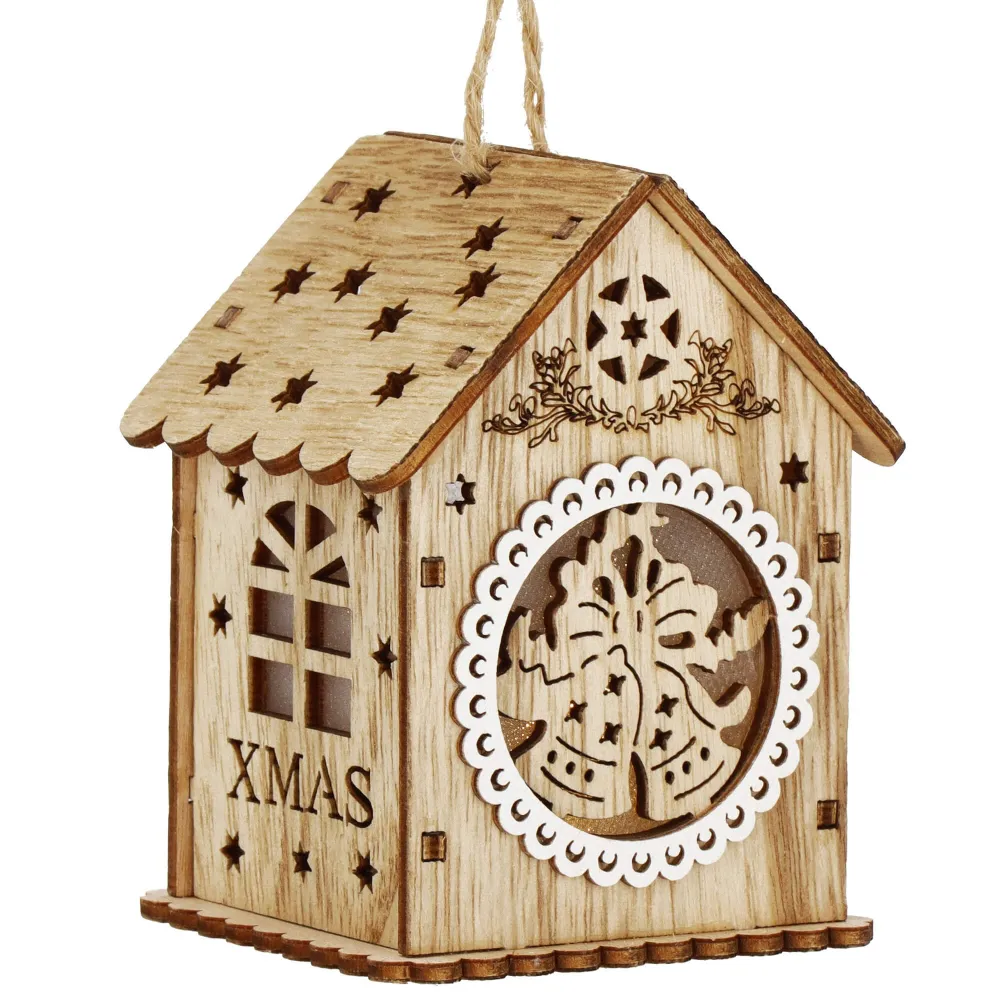 Táto nádherná vianočná ozdoba je vyrobená z kvalitného dreva a očarí svojim detailným rezbárskym spracovaním s motívom domčeka . Ozdoba je vybavená jemným vnútorným osvetlením , ktoré vytvára teplú a príjemnú žiaru, čím oživí akýkoľvek vianočný stromček či dekoráciu.