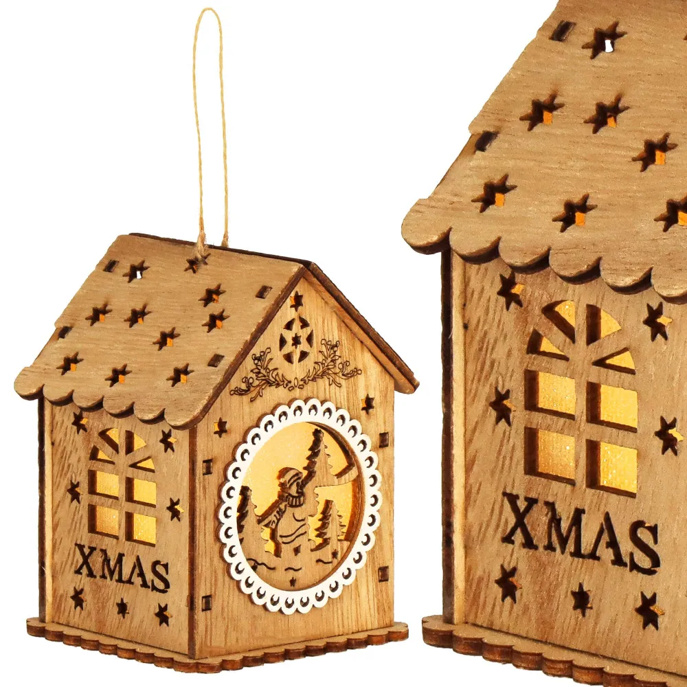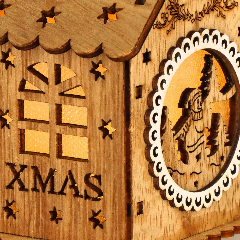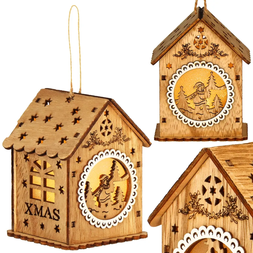 Táto nádherná vianočná ozdoba je vyrobená z kvalitného dreva a očarí svojim detailným rezbárskym spracovaním s motívom domčeka . Ozdoba je vybavená jemným vnútorným osvetlením , ktoré vytvára teplú a príjemnú žiaru, čím oživí akýkoľvek vianočný stromček či dekoráciu.