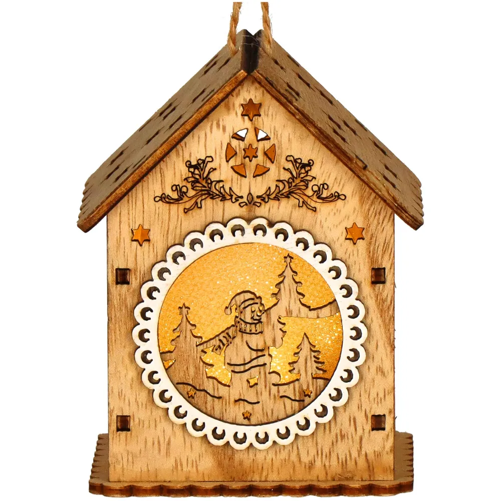 Krásne vyrezávaná drevená ozdoba s motívom domčeka so snehuliakom, ktorá vďaka jemnému osvetleniu vytvára hrejivú atmosféru. Vybavená pútkom pre ľahké zavesenie, je ideálna na vianočný stromček alebo ako dekorácia do interiéru. Výška 9 cm.