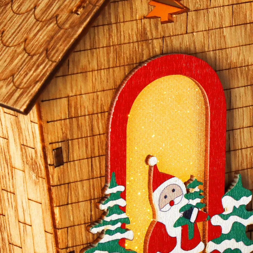 Táto nádherná vianočná ozdoba je vyrobená z kvalitného dreva a očarí svojim detailným rezbárskym spracovaním s motívom domčeka . Ozdoba je vybavená jemným vnútorným osvetlením , ktoré vytvára teplú a príjemnú žiaru, čím oživí akýkoľvek vianočný stromček či dekoráciu.