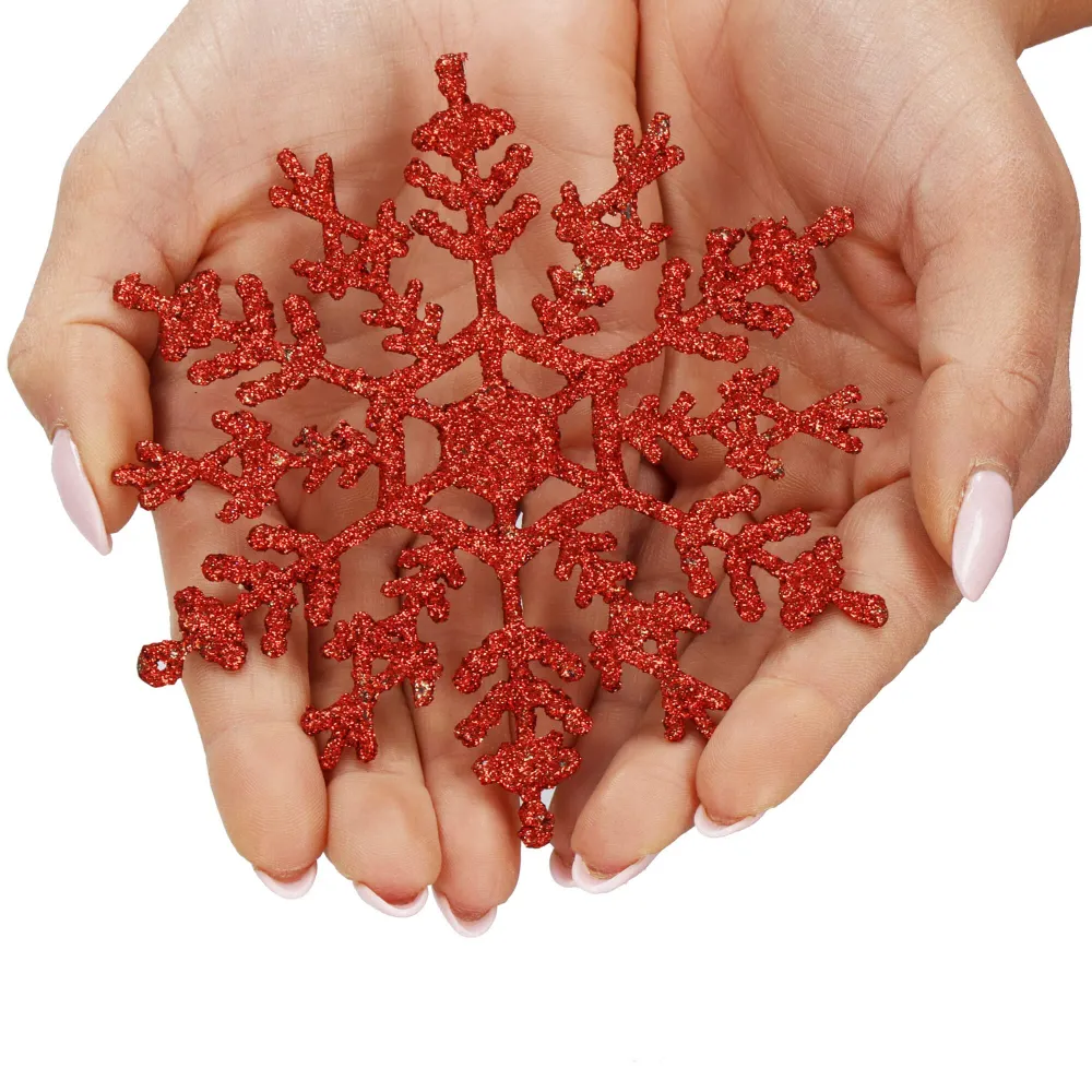 Sada 3 kusov snehových vločiek s očkom na zavesenie. Výška 12 cm, blýskavý povrch s trblietkami, nerozbitný plastový materiál, červená farba. Ideálna ako ozdoba vianočného stromčeka alebo ako vianočná dekorácia.