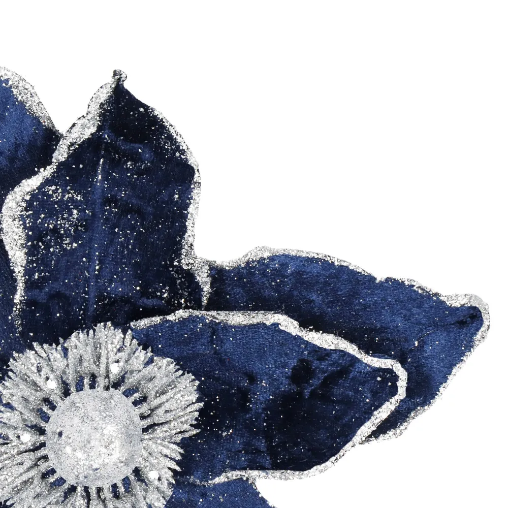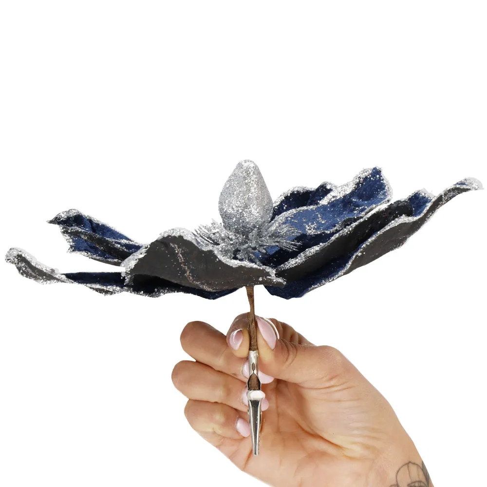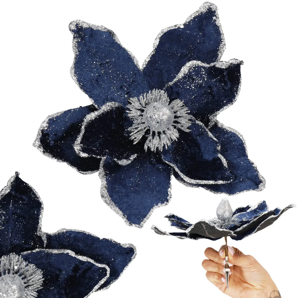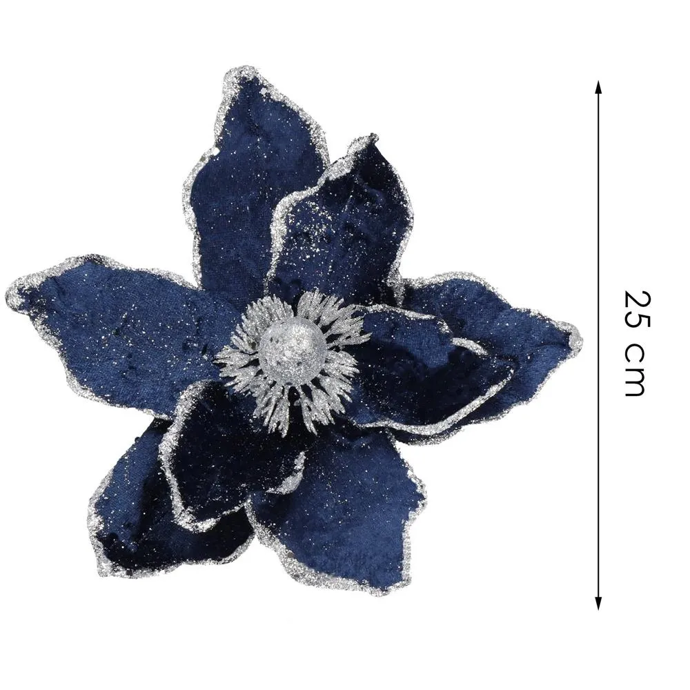 Umelý kvet magnólie so zamatovými okvetnými lístkami so strieborným púčikom. Realistické spracovanie, stonka zakončená klipom pre ľahké pripevnenie do rôznych vianočných aranžmánov. Skvele sa tiež hodí ako ozdoba stromčeka alebo ako samostatná dekorácia. Veľkosť 25x20 cm, modrá farba.