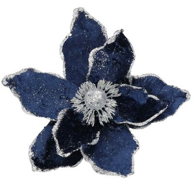 Umelý kvet magnólie so zamatovými okvetnými lístkami so strieborným púčikom. Realistické spracovanie, stonka zakončená klipom pre ľahké pripevnenie do rôznych vianočných aranžmánov. Skvele sa tiež hodí ako ozdoba stromčeka alebo ako samostatná dekorácia. Veľkosť 25x20 cm, modrá farba.
